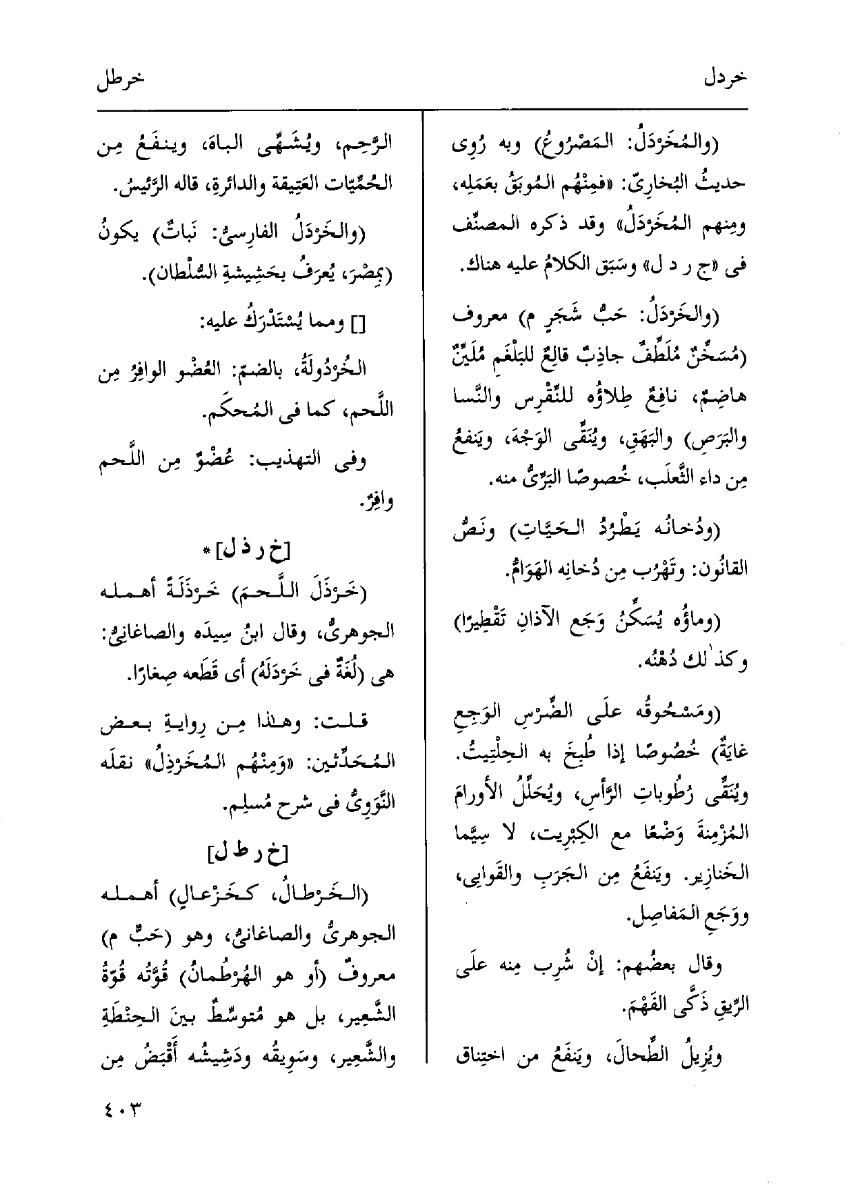 والمُخَردَلُ: المَصْرُوعُ وَبِه روِى حديثُ البُخارِيّ: فمِنْهُم المُوبَقُ بعَمَلِه، ومِنهم المخَردَلٌ وَقد ذكره المُصَنّف فِي ج ر د ل وسَبَق الكلامُ عَلَيْهِ هُنَاكَ. والخَردَلُ: حبُّ شَجَرٍ م مَعْرُوف مُسَخِّنٌ مُلَطِّفٌ جاذِبٌ قالِعٌ للبَلْغَمِ مُلَينٌ هاضِمٌ، نافِعٌ طِلاؤُه للنِّقْرِس والنَّسا والبَرَصِ والبَهَقِ، ويُنَقِّى الوَجْهَ، ويَنفع مِن دَاء الثَّعلَب، خُصُوصا البَرِّيُّ مِنْهُ. ودُخانُه يَطْرُدُ الحَيّاتِ ونَصّ القانُون: وتَهْرُب من دُخانِه الهَوَامُّ. وماؤُه يُسَكِّن وَجَع الآذانِ تَقْطِيراً وَكَذَلِكَ دُهْنُه. ومَسحُوقُه)