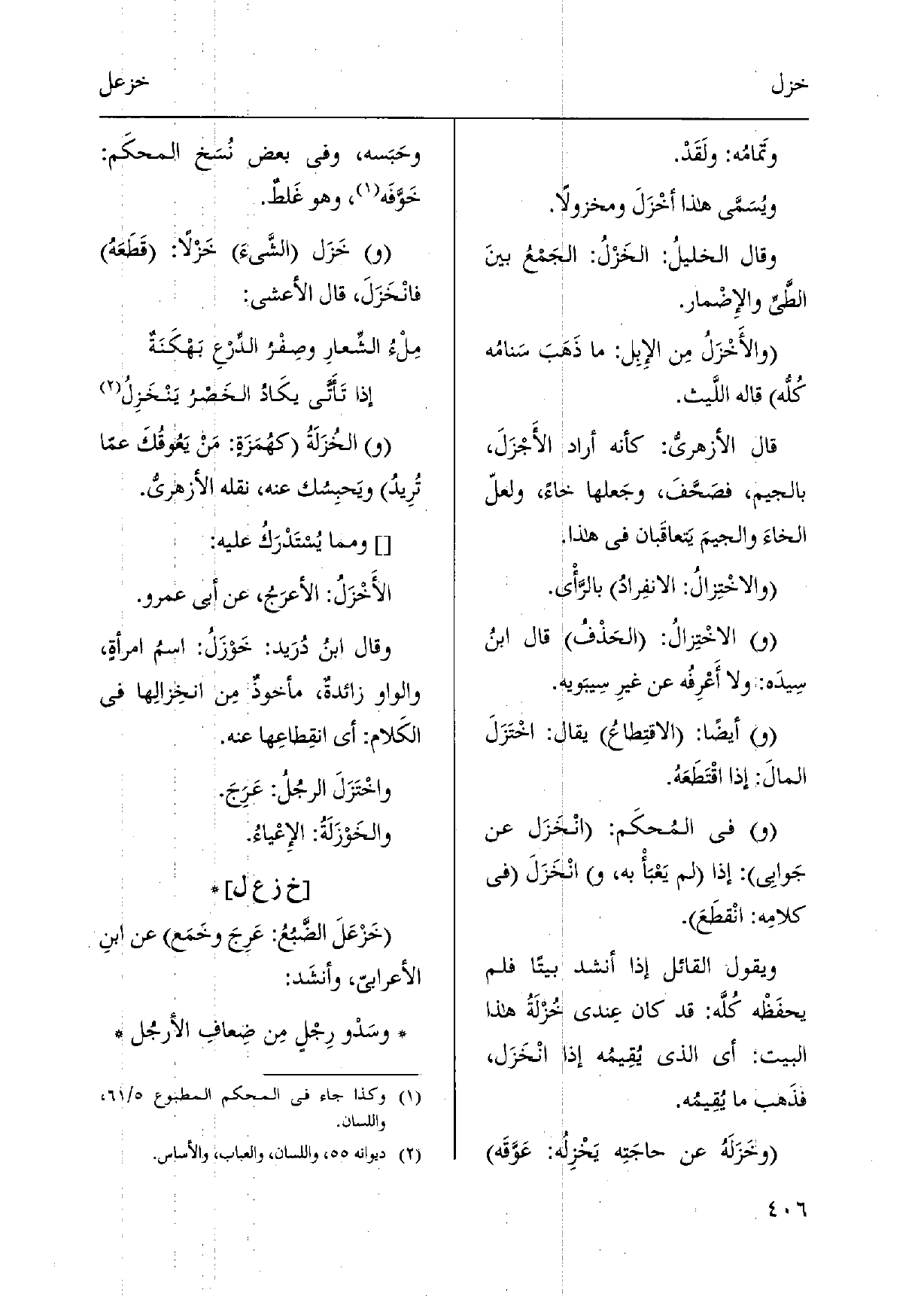 والأَخْزَلُ مِن الإِبِل: مَا ذَهَبَ سَنامُه كُلُّه قَالَه اللَّيث. قَالَ الأزهريّ: كَأَنَّهُ أَرَادَ الأَجْزَلَ، بِالْجِيم، فصَحَّفَ، وجَعلها خاءً، ولعلّ الخاءَ والجيمَ يَتعاقَبان فِي هَذَا. والاخْتِزالُ: الانفِرادُ بالرَّأي.