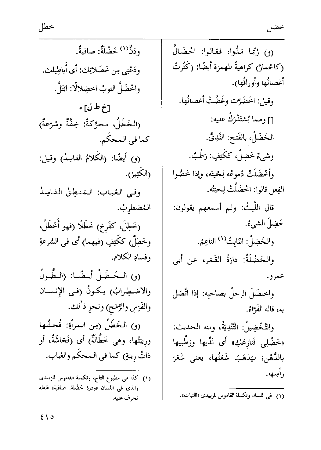 الخَطَلُ، محرَّكةً: خِفَّةٌ وسُرْعةٌ كَمَا فِي المحكَم. أَيْضا: الكَلامُ الفاسِدُ وَقيل: الكَثِيرُ. وَفِي العُباب: المَنطِقُ الفاسِدُ المُضطرِبُ. خَطِلَ، كفَرِحَ خَطَلاً فَهُوَ أَخْطَلُ، وخَطِلٌ ككَتِفٍ فيهمَا أَي فِي السُّرعةِ وفسادِ الْكَلَام. الخَطَلُ أَيْضا: الطُّولُ والاضطِرابُ يكونُ فِي الإِنسان والفَرَسِ والرُّمْحِ ونحوِ ذَلِك. الخَطَلُ مِن المرأةِ: فُحشُها ورِيبَتُها، وَهِي خَطَّالَةٌ أَي فَحّاشَةٌ، أَو ذاتُ رِيبَةٍ كَمَا فِي المحكَم والعُباب.
