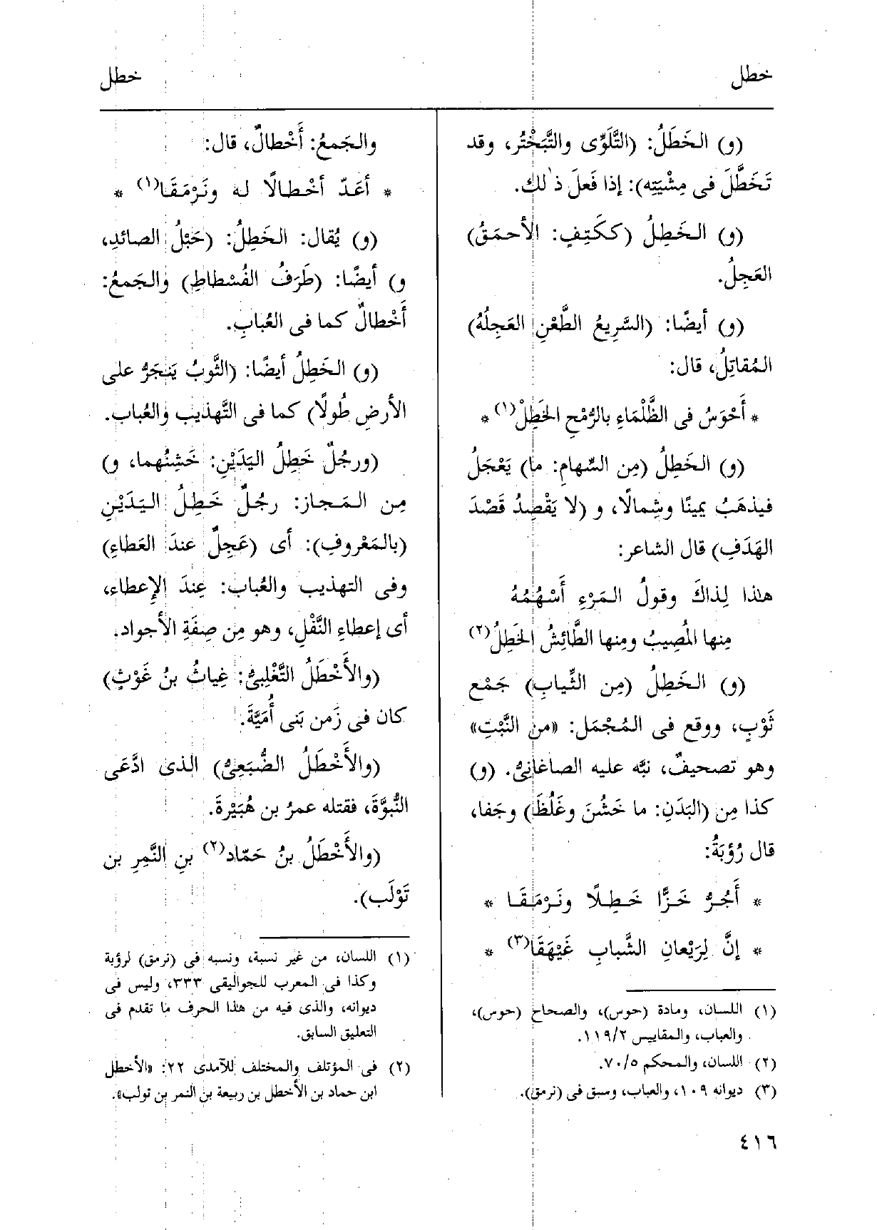 الخَطِلُ مِن الثِّيابِ جَمْع ثَوبٍ، وَوَقع فِي المُجْمَل: من النَّبتِ وَهُوَ تصحيفٌ، نبَّه عَلَيْهِ الصاغانيُّ. كَذَا مِن البَدَنِ: مَا خَشُنَ وغَلُظَ وجَفا، قَالَ رُؤبَةُ: أَجُرُّ خَزّاً خَطِلاً ونَرْمَقَا إنَّ لِرَيْعانِ الشَّبابِ غَيهَقَا والجَمعُ: أَخْطالٌ، قَالَ: أعَدّ أخْطالاً لَهُ ونَرمَقَا يُقال: الخَطِلُ: حَبلُ الصائدِ، أَيْضا: طَرَفُ الفُسطاطِ والجَمعُ: أَخْطالٌ كَمَا فِي العُبابِ. الخَطِلُ أَيْضا: الثَّوبُ يَنجَرُّ على الأرضِ طُولاً كَمَا فِي التَّهذيب والعُباب. ورجُلٌ خَطِلُ اليَدَيْنِ: خَشِنُهما، مِن المَجاز: رجُلٌ خَطِلُ اليَدَيْنِ بالمَعْروفِ: أَي عَجِلٌ عندَ العَطاءِ وَفِي التَّهْذِيب والعُباب: عندَ الإِعطاء، أَي إعطاءِ النَّفْلِ، وَهُوَ مِن صِفَةِ الأجواد. والأَخْطَل التَّغْلِبيُ: غِياثُ بنُ غَوْثٍ كَانَ فِي زَمن بني أُمَيَّةَ. والأَخْطَلُ الضُّبَعِيُّ الَّذِي ادَّعَى النُّبوَّةَ، فَقتله عمرُ بن هُبَيرةَ.