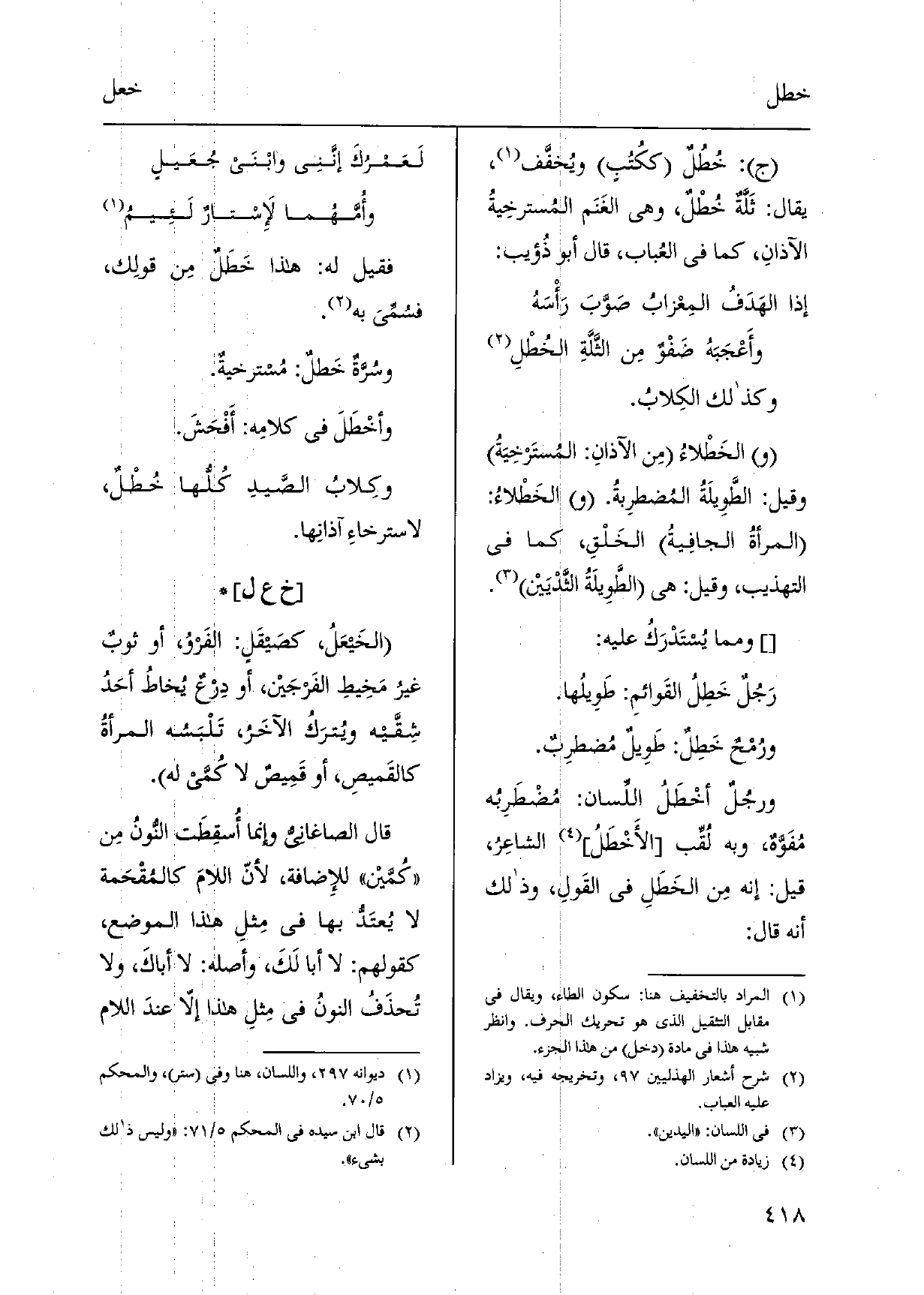 ج: خُطُل ككُتُب ويُخفَّف، يُقَال: ثَلَّةٌ خُطْلٌ، وَهِي الغَنَم المُسترخِيةُ الآذانِ، كَمَا فِي العُباب، قَالَ أَبُو ذُؤيب: