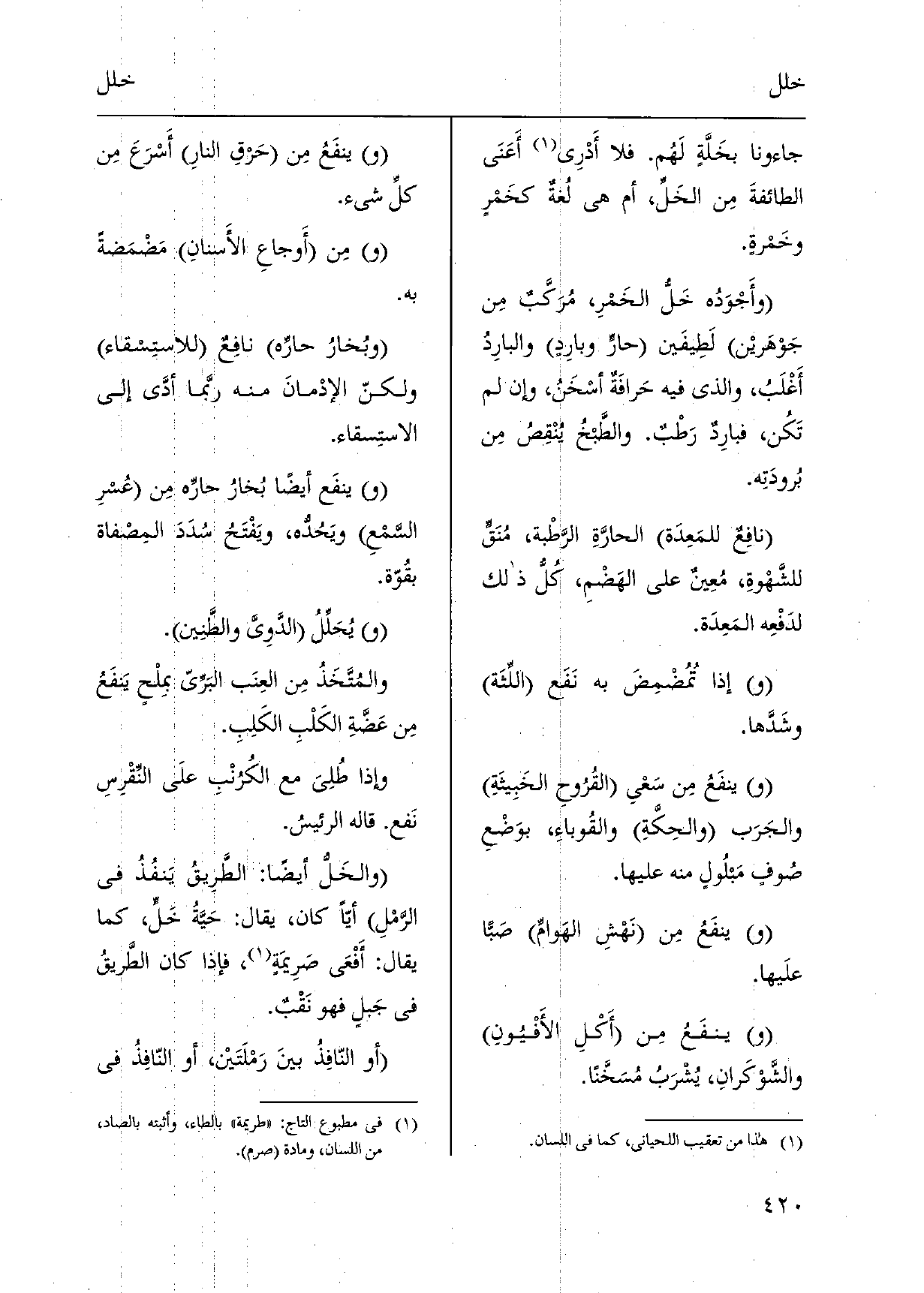 جَاءُونَا {بخَلَّةٍ لَهُم. فَلَا أَدْرِي أَعَنَى الطائفةَ مِن} الخَلِّ، أم هِيَ لُغةٌ كخَمْيرِ وخَمْرةٍ. وأَجْوَدُه {خَلّ الخَمْرِ، مُرَكَّبٌ مِن جَوْهَريْن لَطِيفَين حارٍّ وبارِدٍ والبارِدُ أَغْلَبُ، وَالَّذِي فِيهِ حَرافَةٌ أسْخَنُ، وَإِن لم تَكُن، فبارِدٌ رَطْبٌ. والطَّبخُ يُنْقِصُ مِن بُرودَتِه. نافِعٌ للمَعِدَة الحارَّةِ الرَّطْبة، مُنَقِّ للشَّهْوةِ، مُعِينٌ على الهَضْمِ، كُلُّ ذَلِك لدَفْعِه المَعِدَة. إِذا تُمُضْمِضَ بِهِ نَفَع اللِّثَة وشَدَّها. ينفَعُ مِن سَعْيِ القُرُوحِ الخَبِيثَةِ والجَرَب والحِكَّةِ والقوباءِ، بوَضْعِ صُوفٍ مَبلُولٍ مِنْهُ عَلَيْهَا. ينفَعُ مِن نَهْشِ الهَوامِّ صَبّاً علَيها. ينفَعُ مِن أَكْلِ الأَفْيُونِ والشَّوْكَرانِ، يُشْرَبُ مُسَخَّناً. ينفَعُ مِن حَرقِ النارِ أَسْرَعَ مِن كلِّ شَيْء. مِن أَوجاعِ الأَسنانِ مَضْمَضةً بِهِ.