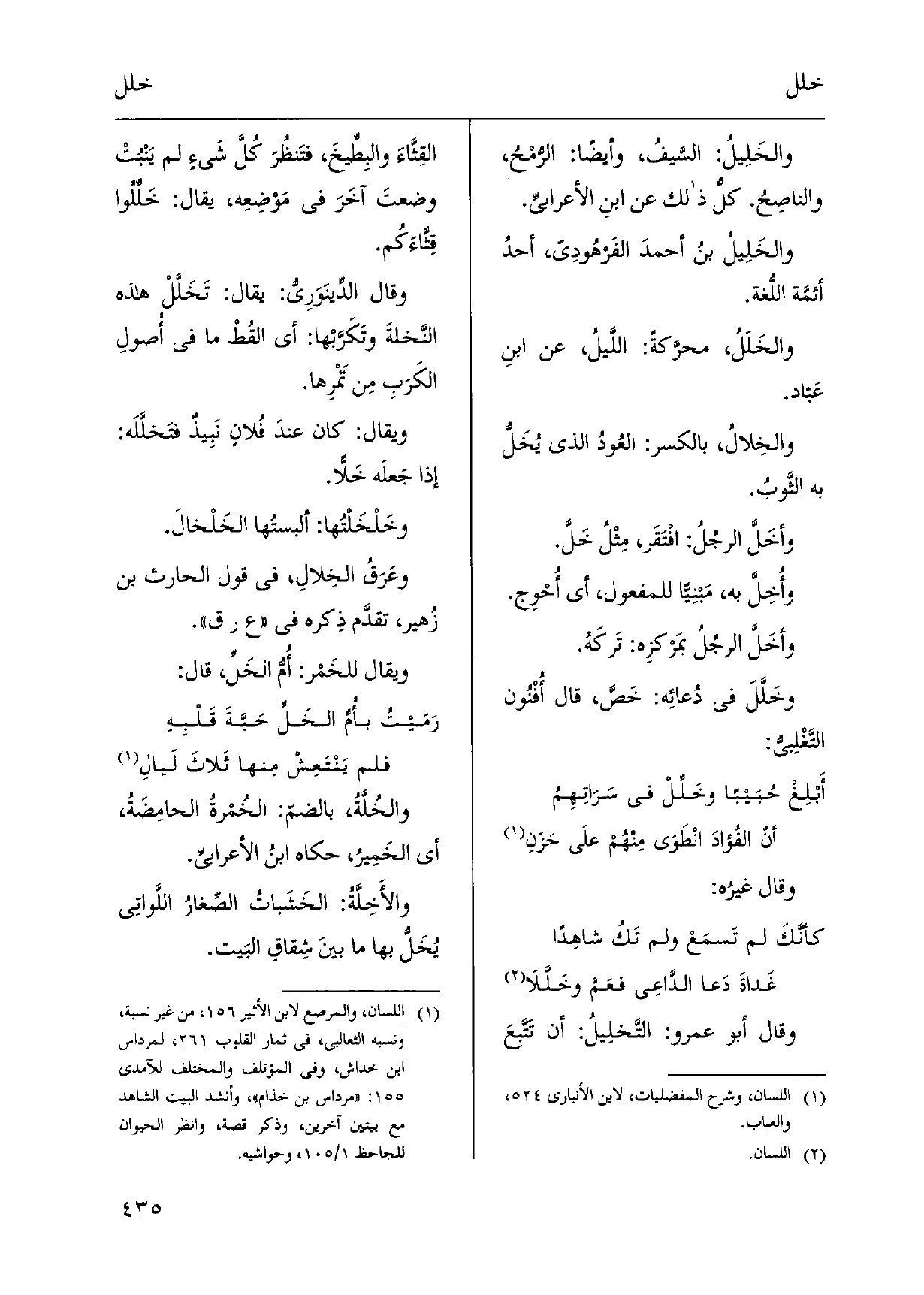 وَقَالَ أَبُو عَمْرو:} التَّخلِيلُ: أَن تَتَّبعَ القثَّاءَ والبِطِّيخَ، فتَنظُرَ كُلَّ شَيْء لم يَنْبُتْ وضعتَ آخَرَ فِي مَوْضِعِه، يُقَال: {خَلِّلُوا قِثَّاءَكُم. وَقَالَ الدِّينَوَرِيُّ: يُقَال:} تَخَلَّلْ هَذِه النَّخلةَ وتَكَرَّبْها: أَي القُطْ مَا فِي أصولِ الكَرَبِ مِن تَمْرِها. وَيُقَال: كَانَ عندَ فُلانٍ نَبِيذٌ {فتَخلَّلَه: إِذا جَعلَه خَلاً.} وخَلْخَلْتُها: ألبستُها الخَلْخالَ. وعَرَقُ الخِلالِ، فِي قَول الْحَارِث بن زُهير، تقدَّم ذِكره فِي ع ر ق. وَيُقَال للخَمْر: أُمُّ {الخَلِّ، قَالَ:
