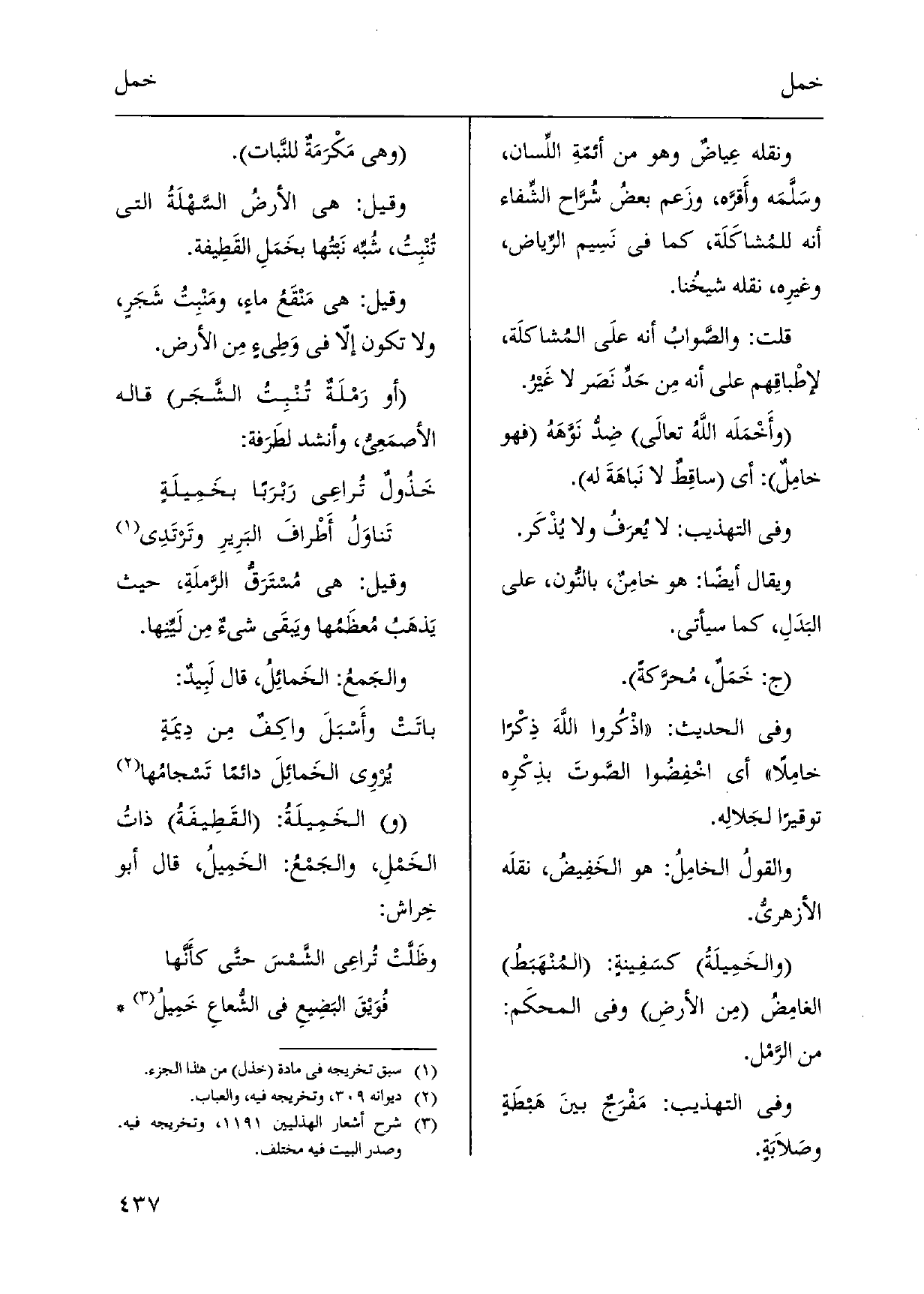وَنَقله عِياضٌ وَهُوَ من أئمّةِ اللِّسان، وسَلَّمَه وأَقرَّه، وزَعم بعضُ شُزرَّاح الشِّفاء أَنه للمُشاكَلَة، كَمَا فِي نَسِيم الرِّياض، وغيرِه، نَقله شيخُنا. قلت: والصَّوابُ أَنه علَى المُشاكلَة، لإطْباقِهم على أَنه مِن حَدِّ نَصَر لَا غَيرُ. وأَخْمَلَه اللَّهُ تعالَى ضِدُّ نَوَّهَهُ فَهُوَ خامِلٌ: أَي ساقِطٌ لَا نَباهَةَ لَهُ. وَفِي التَّهْذِيب: لَا يُعرَفُ وَلَا يُذْكَر. وَيُقَال أَيْضا: هُوَ خامِنٌ، بالنُّون، على البَدَلِ، كَمَا سَيَأْتِي. ج: خَمَلٌ، مُحرَّكةً. وَفِي الحَدِيث: اذْكُروا اللَّهَ ذِكْراً خامِلاً أَي اخْفِضُوا الصَّوتَ بذِكْرِه توقيراً لجَلالِه. والقولُ الخامِلُ: هُوَ الخَفِيضُ، نقلَه الْأَزْهَرِي. والخَمِيلَةُ كسَفِينةٍ: المُنْهَبَطُ الغامِضُ مِن الأرضِ وَفِي المحكَم: من الرَّمْل. وَفِي التَّهْذِيب: مَفْرَجٌ بينَ هَبطَةٍ وصَلاَبَةٍ. وَهِي مَكْرَمَةٌ للنَّبات. وَقيل: هِيَ الأرضُ السَّهْلَةُ الَّتِي تُنْبِتُ، شُبِّه نَبتُها بخَمَلِ القَطِيفة. وَقيل: هِيَ مَنْقَعُ ماءٍ، ومَنْبِتُ شَجَرٍ، وَلَا تكون إلّا فِي وَطِيءٍ مِن الأَرْض. أَو رَمْلَةٌ تُنْبِتُ الشَّجَر قَالَه الأصمَعِيّ، وَأنْشد لطَرَفة: