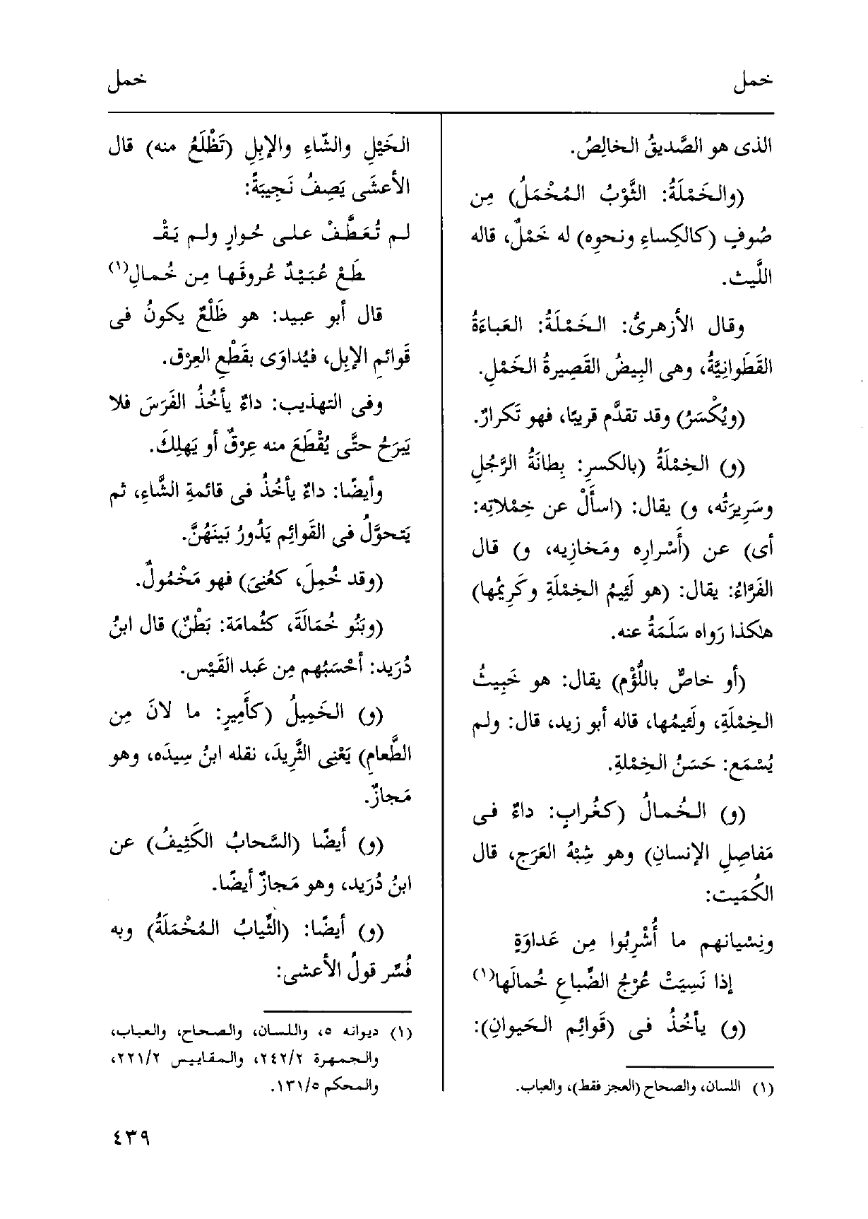 قَالَ أَبُو عبيد: هُوَ ظَلْعٌ يكونُ فِي قَوائمِ الإبِل، فيُداوَى بقَطْعِ العِرق. وَفِي التَّهْذِيب: داءٌ يأخُذُ الفَرَسَ فَلَا يَبرَحُ حتَّى يُقْطَعَ مِنْهُ عِرقٌ أَو يَهلِكَ. وَأَيْضًا: داءٌ يأخُذُ فِي قائمةِ الشَّاءِ، ثمَّ يَتحوَّلُ فِي القَوائِم يَدُورُ بَينَهُنَّ. وَقد خُمِلَ، كعُنِىَ فَهُوَ مَخْمُولٌ. وبَنُو خُمَالَةَ، كثُمامَة: بَطْنٌ قَالَ ابنُ دُرَيد: أحْسَبُهم مِن عَبد القَيس. الخَمِيلُ كأَمِيرٍ: مَا لانَ مِن الطَّعامِ يَعْنِي الثَّرِيدَ، نَقله ابنُ سِيدَه، وَهُوَ مَجازٌ. أَيْضا السَّحابُ الكَثِيفُ عَن ابنُ دُرَيد، وَهُوَ مَجازٌ أَيْضا. أَيْضا: الثِّيابُ المُخْمَلَةُ وَبِه فُسِّر قولُ الْأَعْشَى: