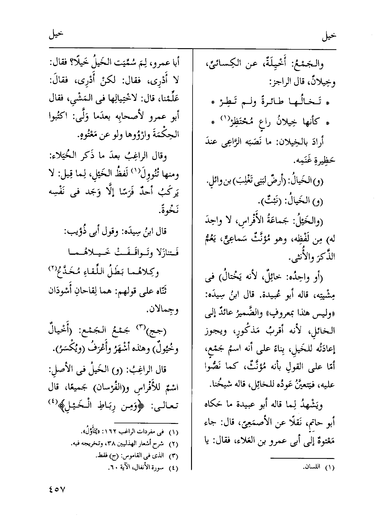 ثَنّاه على قَوْلهم: هما لِقاحانِ أَسْودَان وجِمالان. جج جَمْعُ الجَمْع: {أَخْيالٌ} وخُيُولٌ وَهَذِه أشْهَرُ وأَعْرَفُ ويكْسَرُ. قَالَ الراغِبُ: (و) ! الخَيلُ فِي الأصلِ: اسْمٌ للأَفْراسِ الفُرسان جَميعاً، قَالَ تَعَالَى: وَمِن رِبَاطِ الْخَيلِ