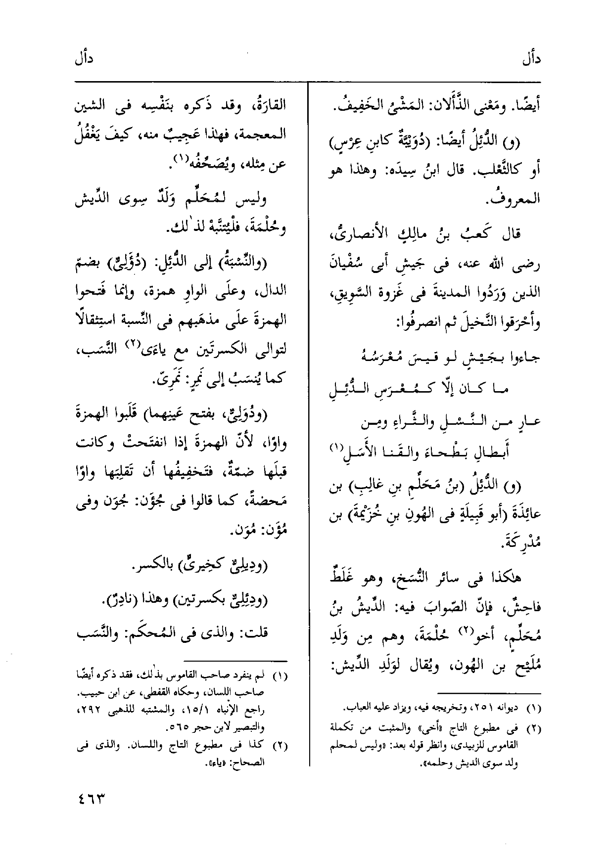 الدُّئِلُ بنُ مَحَلِّمِ بنِ غالِبِ بن عائِذَةَ أَبُو قَبِيلَةٍ فِي الهُونِ بنِ خُزيمةَ بن مُدْرِكَةَ. هَكَذَا فِي سَائِر النُّسَخ، وَهُوَ غَلَطٌ فاحِشٌ، فإنّ الصّوابَ فِيهِ: الدِّيشُ بنُ مُحَلِّمٍ، أَخُو حُلْمَةَ، وهم مِن وَلَدِ مُلَيح بن الهُون، ويُقال لوَلَدِ الدِّيش: القارَةُ، وَقد ذَكره بنَفْسِه فِي الشين الْمُعْجَمَة، فَهَذَا عَجِيبٌ مِنْهُ، كيفَ) يَغْفُلُ عَن مِثله، ويُصَحِّفُه. وَلَيْسَ لمُحَلِّم وَلَدٌ سِوى الدِّيش وحُلْمَةَ، فلْيُتنَّبهْ لذَلِك. والنِّسبَةُ إِلَى الدُّئِلِ:} - دُؤَلِيٌّ بضمّ الدَّال، وعلَى الواوِ همزَة، وَإِنَّمَا فَتحوا الهمزةَ علَى مذهَبهم فِي النِّسبة استِثقالاً لتوالي الكسرتَين مَعَ ياءَي النَّسَب، كَمَا يُنسَب إِلَى نَمِرٍ: نَمَرِيّ. {- ودُوَلِيٌّ، بِفَتْح عَينِهما قَلَبوا الهمزةَ واواً، لأنّ الهمزةَ إِذا انفتَحتْ وَكَانَت قبلَها ضمّةٌ، فتَخفِيفها أَن تَقلِبَها واواً مَحضةً، كَمَا قَالُوا فِي جُؤَن: جُوَن وَفِي مُؤَن: مُوَن.} - ودِيليٌّ كخِيريٍّ بِالْكَسْرِ.! - ودِئِلِيٌّ بكسرتين وَهَذَا نادِرٌ.