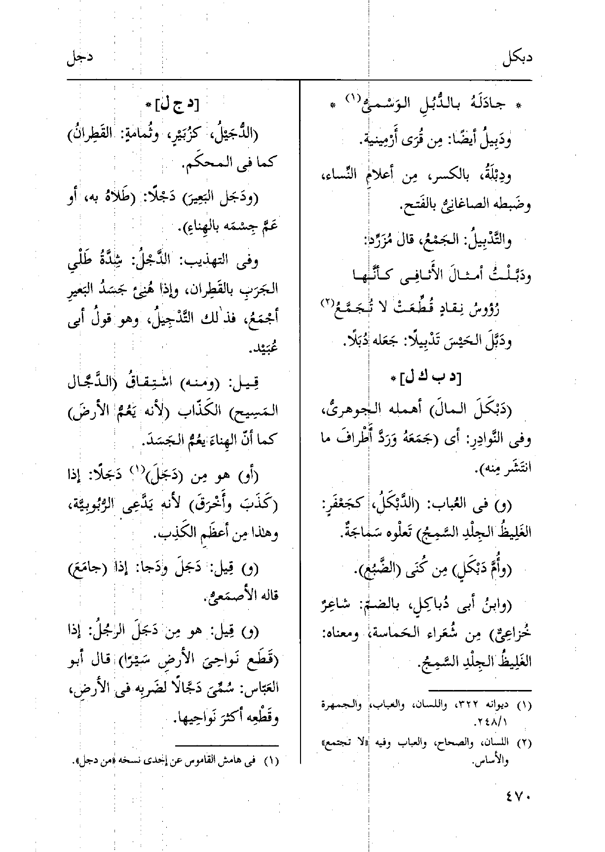 دَبْكَلَ المالَ أهمله الجوهريّ، وَفِي النَّوادِرِ: أَي جَمَعَهُ وَرَدَّ أَطْرافَ مَا انتَشَرمِنه. فِي العُباب: الدَّبْكَلُ، كجَعْفَرٍ: الغَلِيظُ الجِلْدِ السَّمِجُ تَعلْوه سَماجَةٌ. وأُمَّ دَبْكَلٍ مِن كُنَى الضَّبع. وابنُ أبي دُباكِلٍ، بالضمّ: شاعِرٌ خُزاعِيٌّ مِن شُعَراء الحَماسة، وَمَعْنَاهُ: الغَلِيظُ الجِلْدِ السَّمِجُ.