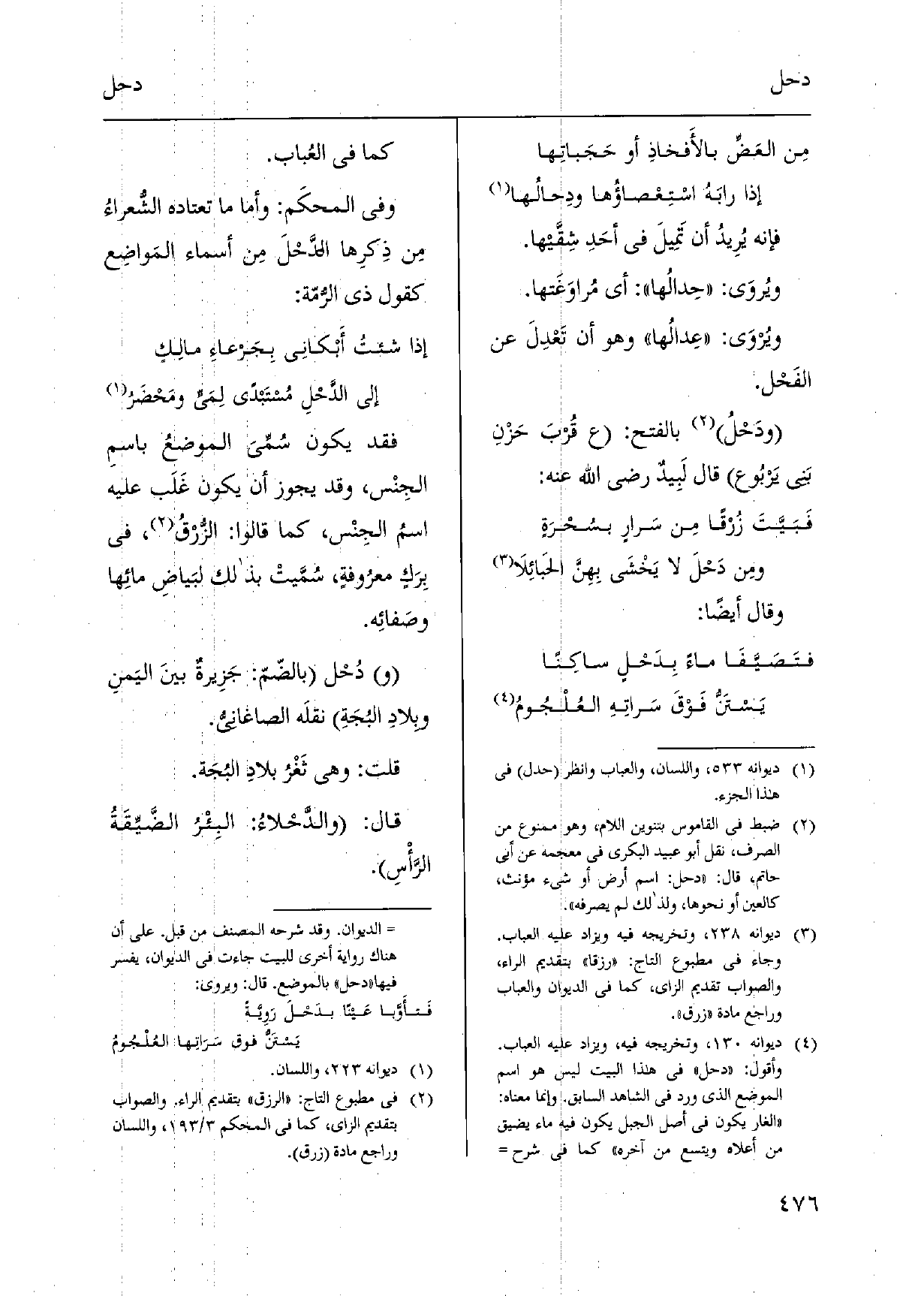 كَمَا فِي العُباب. وَفِي المحكَم: وَأما مَا تعتاده الشّعراءُ مِن ذِكرِها الدَّحْلَ مِن أَسمَاء المَواضِع كَقَوْل ذِي الرّمّة: