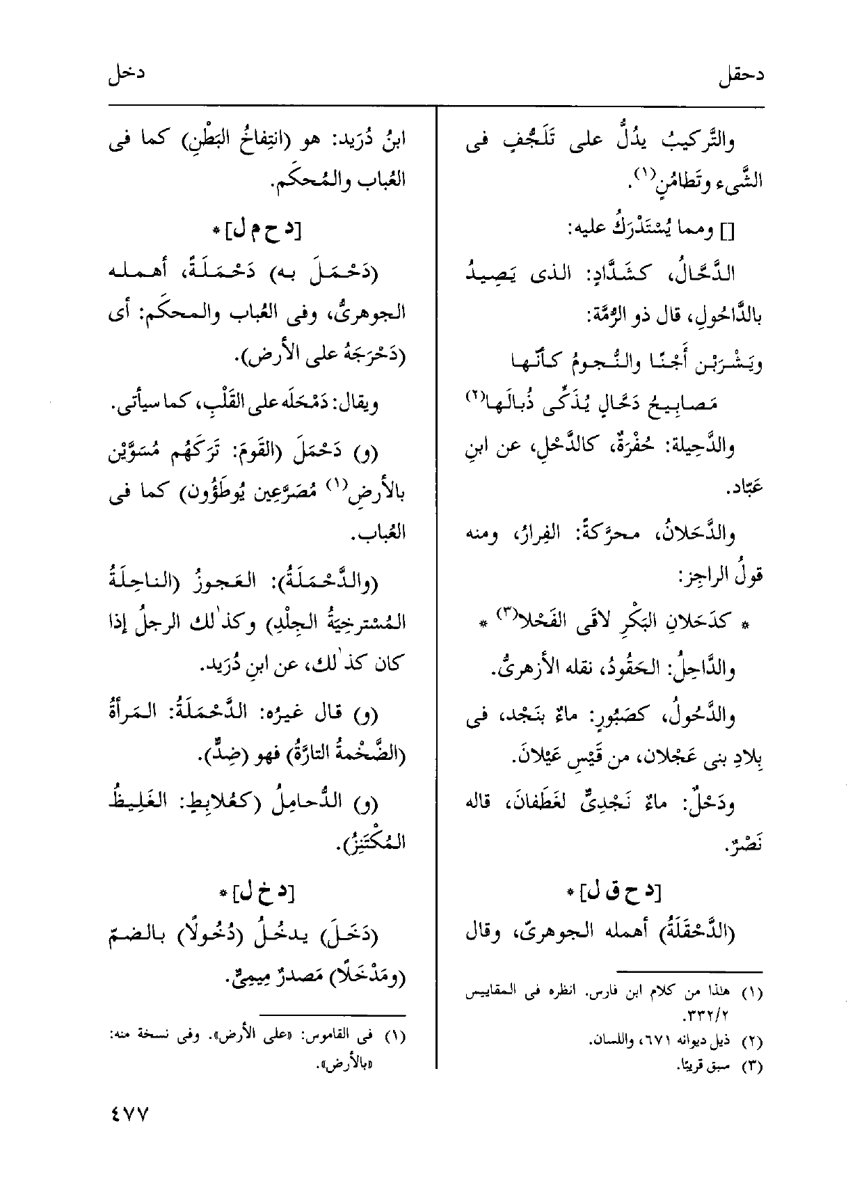 دَحْمَلَ بِهِ دَحْمَلَةً، أهمله الجوهريّ، وَفِي العُباب والمحكَم: أَي دَحْرَجَهُ على الأَرْض. وَيُقَال: دَمْحَلَه على القَلْبِ، كَمَا سَيَأْتِي. دَحْمَلَ القَومَ: تَرَكَهُم مُسَوَّيْن بالأرضِ مُصَرَّعِين يُوطَؤُون كَمَا فِي العُباب. والدَّحْمَلَةُ: العَجوزُ الناحِلَةُ المُسترخِيَةُ الجِلْدِ وَكَذَلِكَ الرجلُ إِذا كَانَ كَذَلِك، عَن ابنِ دُرَيد. قَالَ غيرُه: الدَّحْمَلَةُ: المَرأةُ الضَّخْمةُ التارَّةُ فَهُوَ ضِدٌّ. الدُّحامِلُ كعُلابِطٍ: الغَلِيظُ المُكْتَنِزُ.