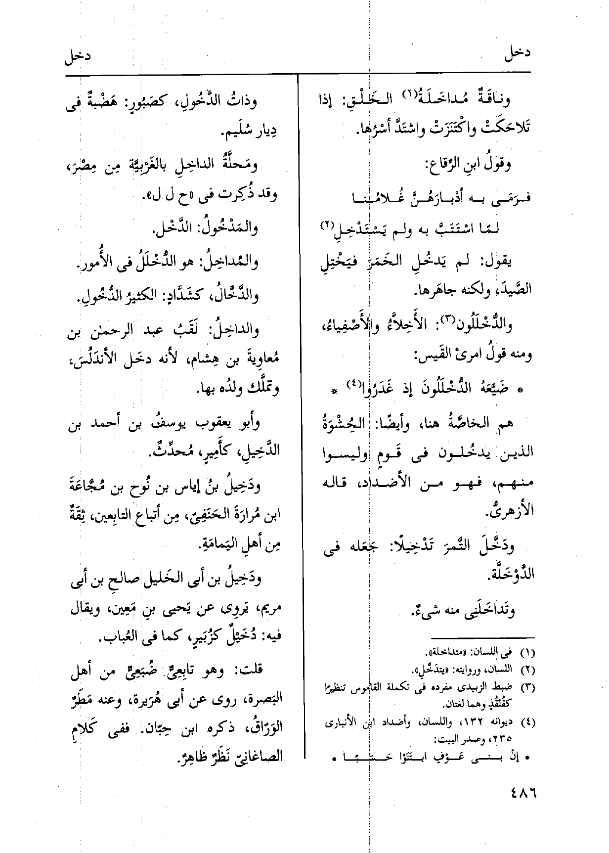 قولُ امْرِئ القَيس: ضَيَّعَهُ الدُّخْلَلُونَ إِذْ غَدَرُوا هم الخاصَّةُ هُنَا، وَأَيْضًا: الحُشْوَةُ الَّذين يدخُلون فِي قَومٍ وَلَيْسوا مِنْهُم، فَهُوَ من الأضداد، قَالَه الأزهريّ. ودَخَّلَ التَّمرَ تَدْخِيلاً: جَعَله فِي الدَّوْخَلَّة. وتَداخَلَنى مِنْهُ شَيْء. وذاتُ الدّخُولِ، كصَبُورٍ: هَضبة فِي ديارسُلَيم. ومَحلَّةُ الداخِلِ بالغَربيَّة مِن مِصْرَ، وَقد ذُكِرت فِي ح ل ل. والمَدْخُولُ: الدَّخْل. والمُداخِلُ: هُوَ الدُّخْلَلُ فِي الأُمور. والدَّخَّالُ، كشَدَّادٍ: الكثيرُ الدُّخُولِ.