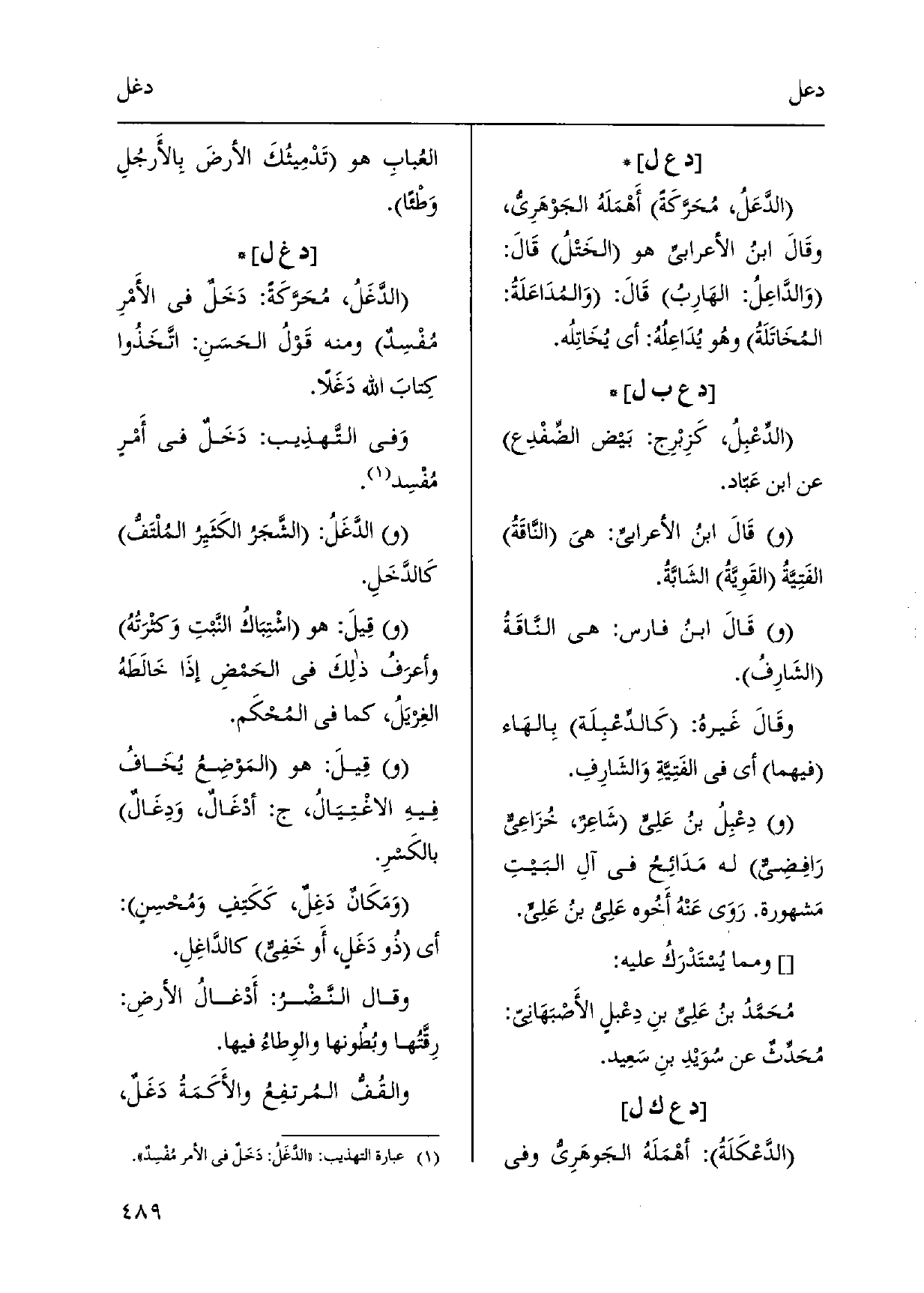 الدَّعَلُ، مُحَرَّكَةً أَهْمَلَهُ الجَوْهَرِي وقَالَ ابْن الْأَعرَابِي هُوَ الخَتْلُ قَالَ وَالدَّاعِلُ: الهَارِب قَالَ: وَالمُدَاعَلَةُ المُخَاتَلَةُ وهُو يُدَاعِلُهُ: أَي يُخَاتِله.