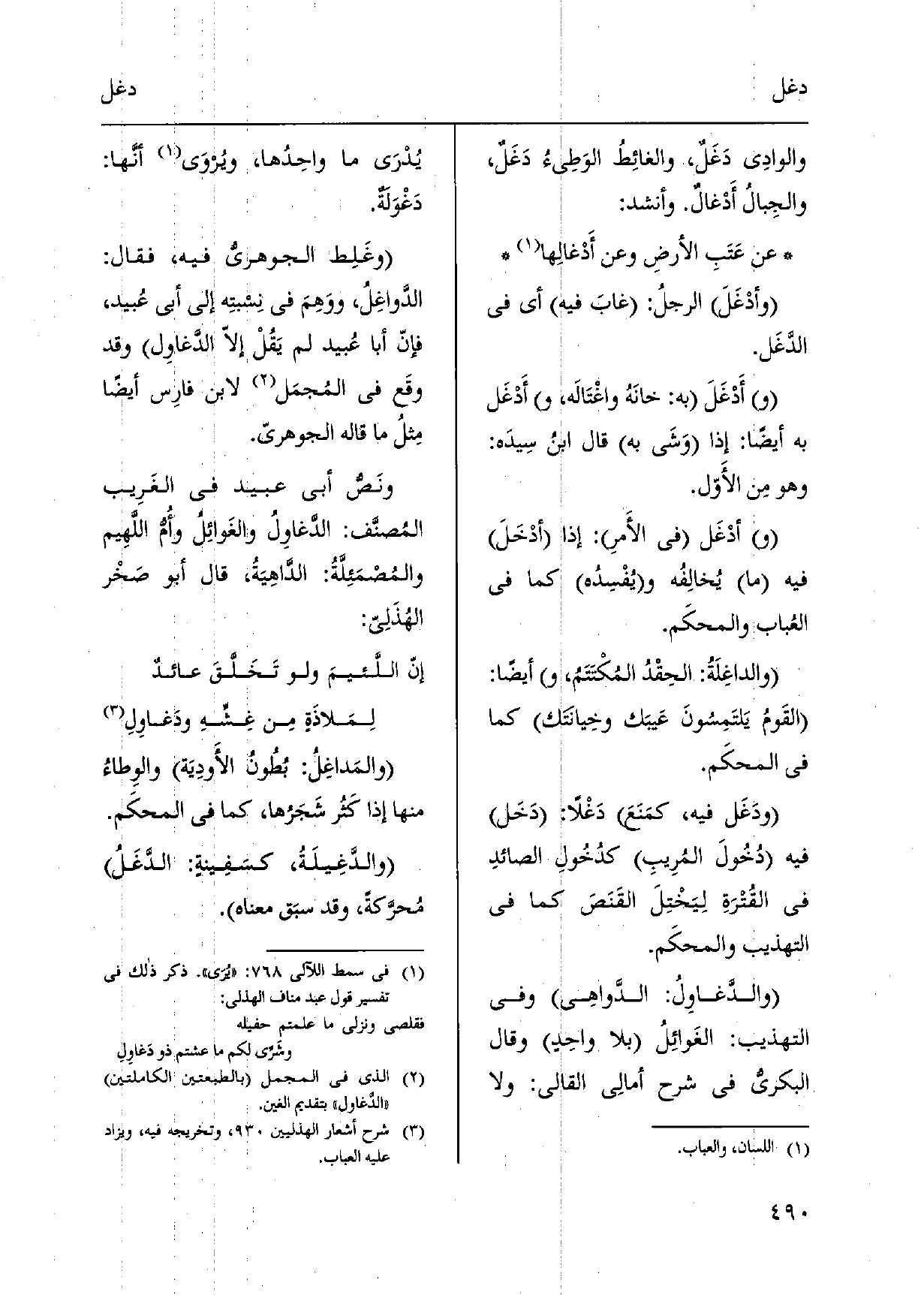 والوادِي دَغَلٌ، والغائِطُ الوَطِيءُ دَغَلٌ، والجِبالُ أَدْغالٌ. وَأنْشد: عَن عَتَبِ الأرضِ وَعَن أَدْغالِها وأدْغَلَ الرجلُ: غابَ فِيهِ أَي فِي الدَّغَل. أَدْغَلَ بِهِ: خانَهُ واغْتَالَه، أَدْغَل بِهِ أَيْضا: إِذا وَشَى بِهِ قَالَ ابنُ سِيدَه: وَهُوَ مِن الأَول. أدْغَل فِي الأَمرِ: إِذا أدْخَلَ فِيهِ مَا يُخالِفُه يُفْسِدُه كَمَا فِي العُباب والمحكَم. والداغِلَةُ: الحِقْدُ المُكْتَتَمُ، أَيْضا: القَومُ يَلتَمِسُونَ عَيبَك وخِيانتك كَمَا فِي المحكَم. ودَغَل فِيهِ، كمَنَعَ دَغْلاً: دَخَل فِيهِ دُخُولَ المُرِيبِ كدُخُولِ الصائدِ فِي القُتْرَةِ لِيَخْتِلَ القَنَصَ كَمَا فِي التَّهْذِيب والمحكَم. والدَّغاوِلُ: الدَّواهي وَفِي التَّهْذِيب: الغَوائِلُ بِلَا واحِدٍ وَقَالَ البكريُّ فِي شرح أمالِي القالي: وَلَا يُدْرَى مَا واحِدُها، ويُروَى أنَّها: دَغْوَلَةٌ. وغَلِط الجوهريّ فِيهِ، فَقَالَ: الدَّواغِلُ، ووَهِمَ فِي نِسبتِه إِلَى أبي عُبيد، فإنّ أَبَا عُبيد لم يَقُلْ إلاّ الدَّغاوِل وَقد وقَع فِي المُجمَل لِابْنِ فارِس أَيْضا مِثلُ مَا قَالَه الجوهريّ. ونَصُّ أبي عبيد فِي الغَرِيب المُصنَّف: الدَّغاوِلُ والغَوائِلُ وأُمُّ اللَّهِيم والمُصْمَئِلَّة: الدَّاهِيَةُ، قَالَ أَبُو صَخْر الهُذَلِي: