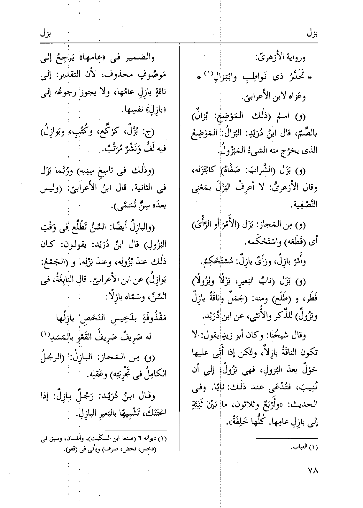 وَرِوَايَة الأزهريّ: تَحَدُّرُ ذِي نَواطِبِ وابْتِزالِ وعَزاه لِابْنِ الْأَعرَابِي. اسمُ ذَلِك المَوْضِعِ: بُزالٌ بالضَّمّ، قَالَ ابنُ دُرَيْدٍ: البُزالُ: المَوْضِعُ الَّذِي يخرُج مِنْهُ الشَّيْء المَبزُولُ. بَزَل الشَّرابَ: صَفَّاه كابْتَزَله، وَقَالَ الأزهريُّ: لَا أعرِفُ البَزْلَ بمَعْنى التَّصْفِية. من المَجاز: بَزَل الأَمْرَ أَو الرَّأي أَي قَطَعَه واسْتَحْكَمه. وأَمْرٌ بازِلٌ، ورَأيٌ بازِلٌ: مُسْتَحْكِمٌ. بَزَل نابُ البَعيرِ، بَزْلاً وبُزُولاً فَطَر، وطَلَع وَمِنْه: جَمَلٌ وناقَةٌ بازِلٌ وبَزُولٌ للذَّكر والأُنثى، عَن ابْن دُرَيْد. وَقَالَ شيخُنا: وَكَانَ أَبُو زيدٍ يَقُول: لَا تكون الناقَةُ بازِلاٌ، وَلَكِن إِذا أَتَى عَلَيْهَا حَوْلٌ بعدَ البُزولِ، فَهِيَ بَزُولٌ، إِلَى أَن تُنِيبَ، فتُدْعَى عِنْد ذَلِك: ناباً. وَفِي الحَدِيث: وأَرْبَعٌ وَثَلَاثُونَ، مَا بَيْنَ ثَنِيَّةٍ إِلَى بازِلِ عامِها. كُلُّها خَلِفَةٌ. وَالضَّمِير فِي عامها يَرجِعُ إِلَى مَوصُوفٍ مَحْذُوف، لِأَن التَّقْدِير: إِلَى ناقةٍ بازِلٍ عامُها، وَلَا يجوز رجوعُه إِلَى بازِلٍ نفسِها. ج: بُزَّلٌ، كرُكَّع، وكُتُبٍ، وبَوازِلُ فِيهِ لَفُّ وَنَشْرٌ مُرَتَّبٌ. وَذَلِكَ فِي تاسِعِ سِنِيه ورُبَّما بَزَل فِي الثَّانِيَة. قَالَ ابنُ الأعرابيّ: وَلَيْسَ بعدَه سِنٌّ تُسَمَّى. والبازِلُ أَيْضا: السِّنّ تَطْلُع فِي وَقْتِ البُزُولِ قَالَ ابنُ دُرَيْد: يَقُولُونَ: كَانَ ذَلِك عندَ بُزُولِه، وعندَ بَزْلِه. الجَمعُ: بَوازِلُ عَن ابْن الأعرابيّ. قَالَ النابِغَةُ، فِي السِّنِّ، وسَمّاه بازِلاً: