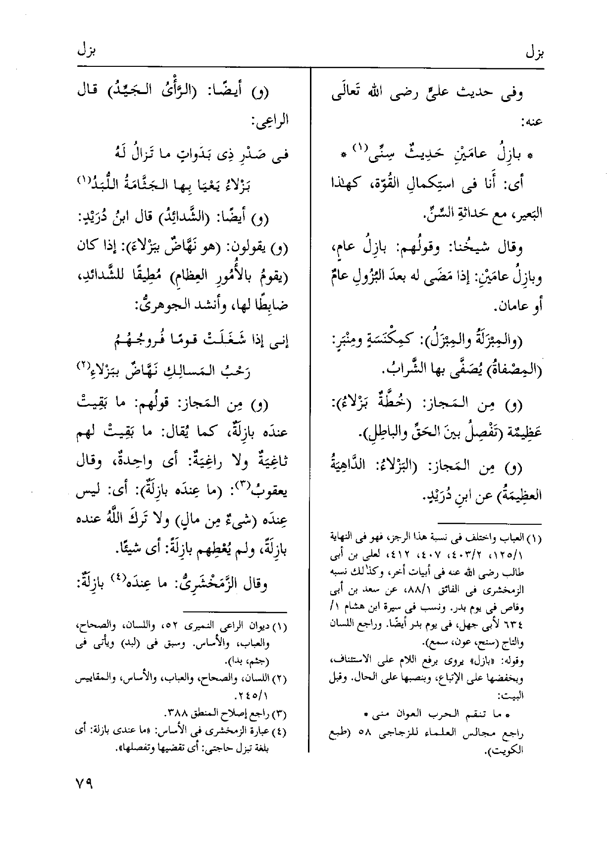 وَفِي حَدِيث عَليّ رَضِي الله تَعالَى عَنهُ: بازِلُ عامَيْنِ حَدِيثٌ سِنِّي أَي: أَنا فِي استِكمالِ القُوّة، كَهَذا البَعير، مَعَ حَداثةِ السِّنِّ. وَقَالَ شيخُنا: وقولُهم: بازِلُ عامٍ، وبازِلُ عامَيْنِ: إِذا مَضَى لَهُ بعدَ البزُولِ عامٌ أَو عامان. والمِبْزَلَةُ والمِبْزَلُ: كمِكْنَسَةٍ ومِنْبَرٍ: المِصْفاةُ يُصَفَّى بهَا الشَّرابُ. من المَجاز: خُطَّةٌ بَزْلاءُ: عَظِيمةٌ تَفْصِلُ بينَ الحَقِّ والباطِلِ. من المَجاز: البَزْلاءُ: الدَّاهِيَةُ العظيمَةُ عَن ابنِ دُرَيْدٍ. وَأَيْضًا: الرَّأي الجَيِّدُ قَالَ الراعِي: