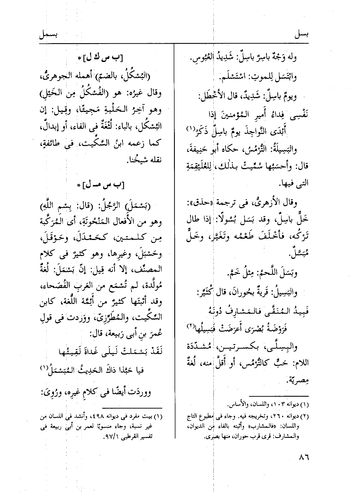 وَله وَجْهٌ باسِرٌ باسِلٌ: شَدِيدُ العُبُوسِ. وابْتَسَل لِلموتِ: اسْتَسلَم. ويومٌ باسِلٌ: شَدِيدٌ، قَالَ الأخْطَل: