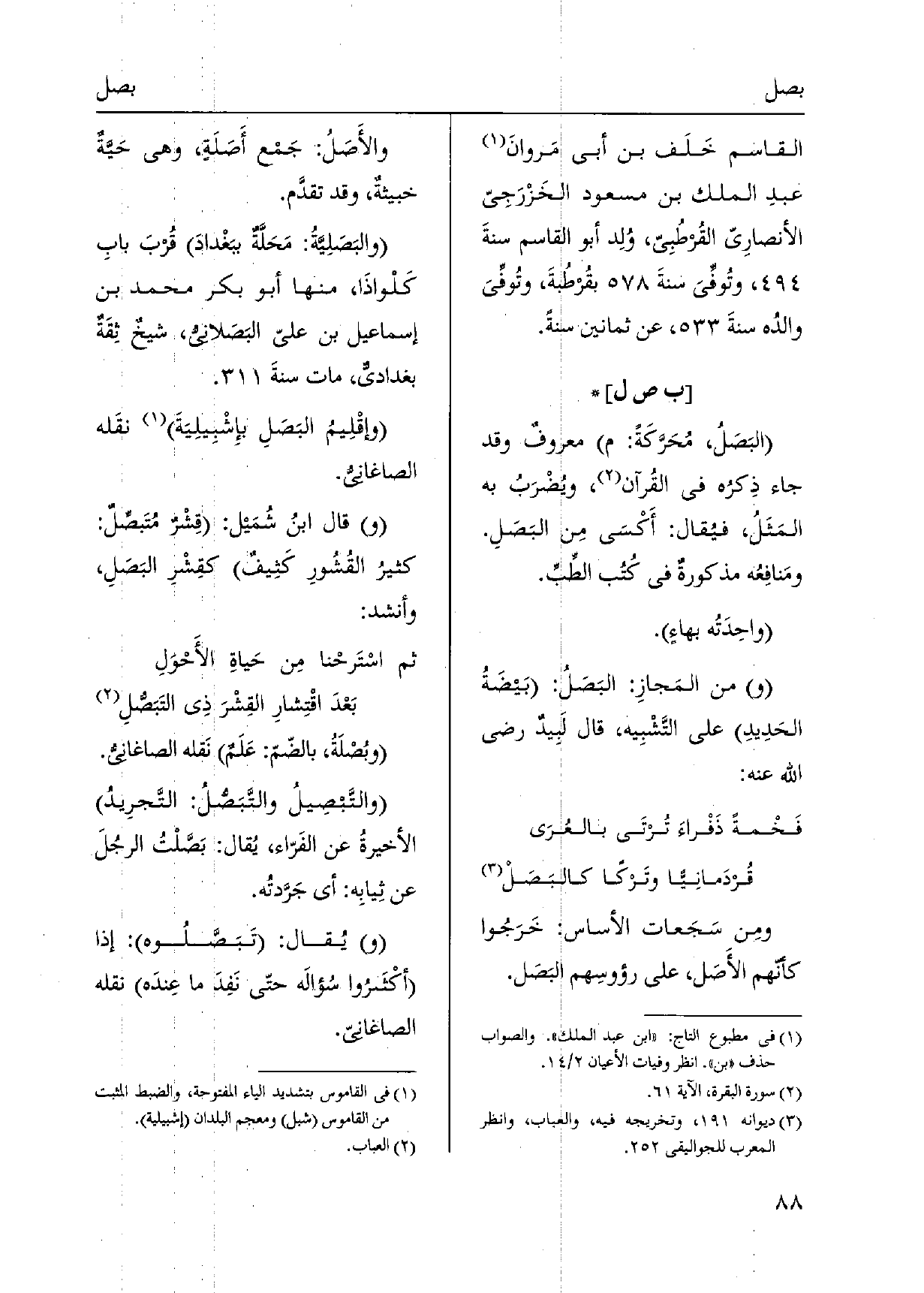 ومِن سَجَعات الأساس: خَرَجُوا كَأَنَّهُمْ الأَصَل، على رؤوسِهم البَصَل. والأَصَلُ: جَمْع أَصَلَةٍ، وَهِي حَيَّةٌ خبيثةٌ، وَقد تقدَّم. والبَصَلِيَّةُ: مَحَلَّةٌ ببَغْدادَ قُربَ بابِ كَلْواذَا، مِنْهَا أَبُو بكر مُحَمَّد بن إِسْمَاعِيل بن عليّ البَصَلانيُّ، شيخٌ ثِقَةٌ بغداديٌّ، مَاتَ سنةَ. وإقْلِيمُ البَصَلِ بإِشْبِيلِيَةَ نقَله الصاغانيُّ. قَالَ ابنُ شُمَيْل: قِشْرٌ مُتَبصِّل: كثيرُ القُشُورِ كَثِيفٌ كقِشْرِ البَصَلِ، وَأنْشد:
