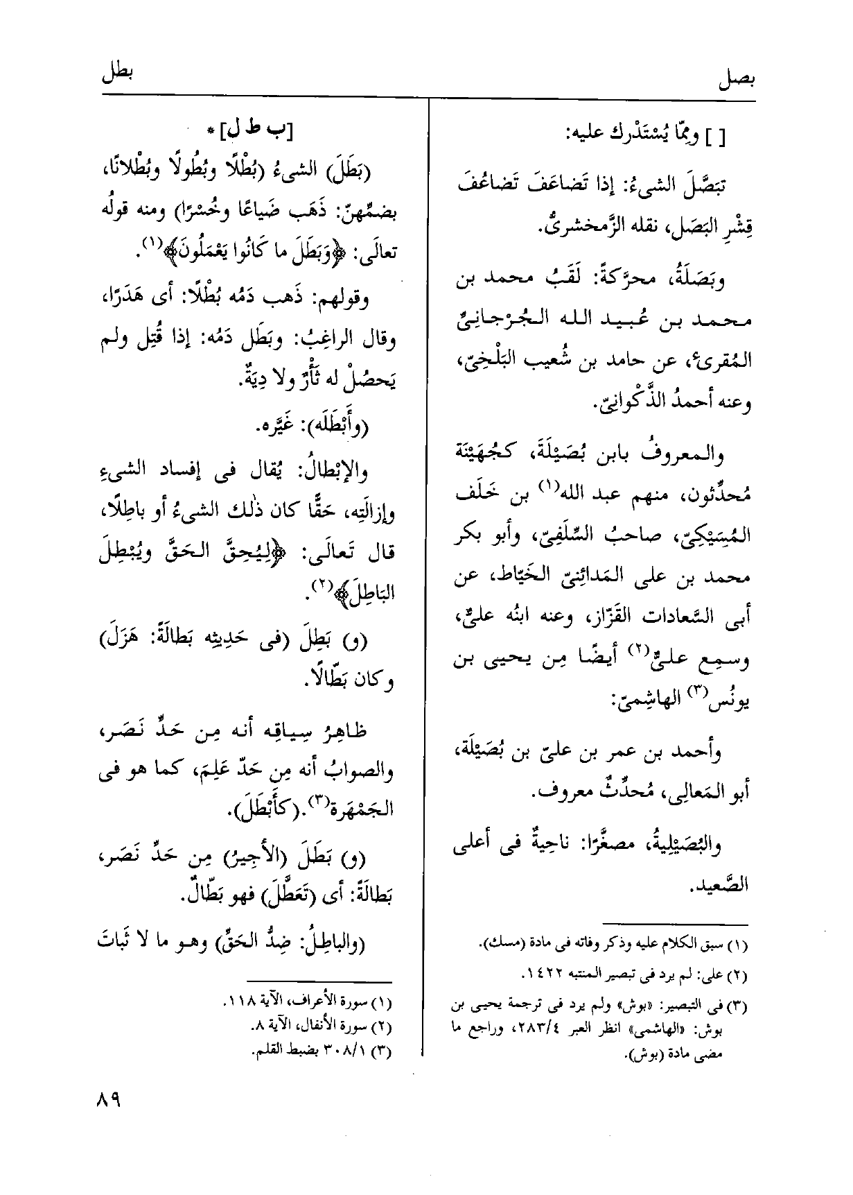 بَطَلَ الشيءُ بُطْلاً وبُطُولاً وبُطْلاناً، بضمِّهنّ: ذَهَب ضَياعاً وخُسْراً وَمِنْه قولُه تعالَى: وَبَطَلَ مَا كَانُوا يَعْمَلُونَ. وَقَوْلهمْ: ذَهب دَمُه بُطْلاً: أَي هَدَراً، وَقَالَ الراغِبُ: وبَطَل دَمُه: إِذا قُتِل وَلم يَحصُلْ لَهُ ثَأْرٌ وَلَا دِيَةٌ. وأَبْطَلَه: غَيَّره. والإبْطالُ: يُقال فِي إِفْسَاد الشَّيْء وإزالَتِه، حَقّاً كَانَ ذَلِك الشَّيْء أَو باطِلاً، قَالَ تَعالَى: لِيُحِقَّ الحَقَّ ويُبطِلَ البَاطِلَ. بَطِلَ فِي حَدِيثه بَطالَةً: هَزَلَ وَكَانَ بَطّالاً. ظاهِرُ سِياقِه أَنه مِن حَدِّ نَصَر، والصوابُ أَنه مِن حَدّ عَلِمَ، كَمَا هُوَ فِي الجَمْهَرة.