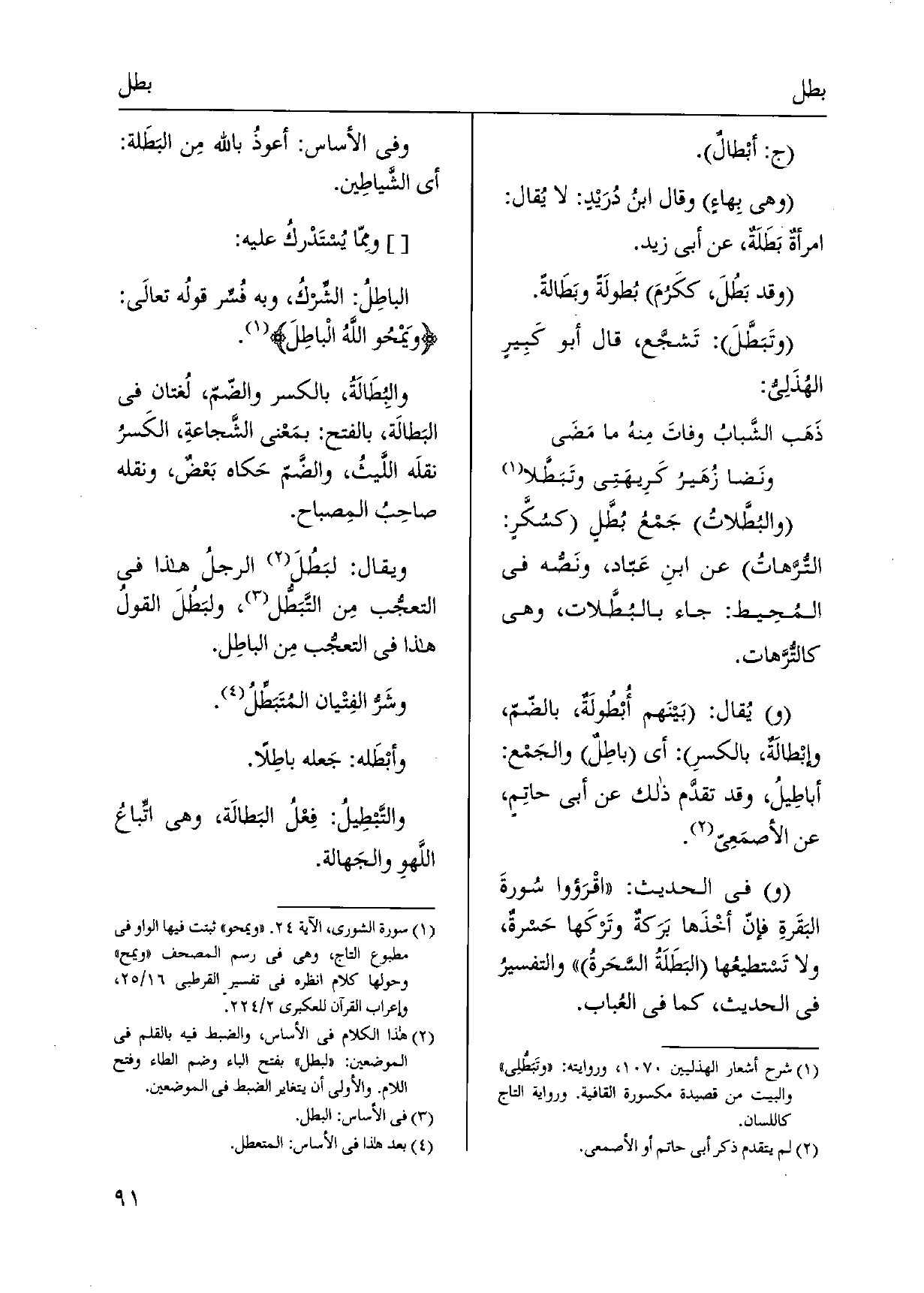 وَمِمَّا يسْتَدرك عَلَيْهِ: الباطِلُ: الشِّركُ، وَبِه فُسِّر قولُه تعالَى: وَيمْحُو اللَّهُ الْباطِلَ. والبُطَالَةُ، بِالْكَسْرِ والضّمّ، لُغتان فِي البَطالَة، بِالْفَتْح: بمَعْنى الشَّجاعة، الكَسرُ نقلَه اللَّيث، والضَّمّ حَكاه بَعْضٌ، وَنَقله صاحبُ المِصباح. وَيُقَال: لبَطُلَ الرجلُ هَذَا فِي التعجُّب مِن التَّبَطل، ولبَطُلَ القولُ هَذَا فِي التعجُّب مِن الباطِل. وشَرُّ الفِتْيان المُتَبَطِّلُ. وأبْطَله: جَعله باطِلاً. والتَّبْطِيلُ: فِعْلُ البَطالَة، وَهِي اتِّباعُ اللَّهوِ والجَهالة.