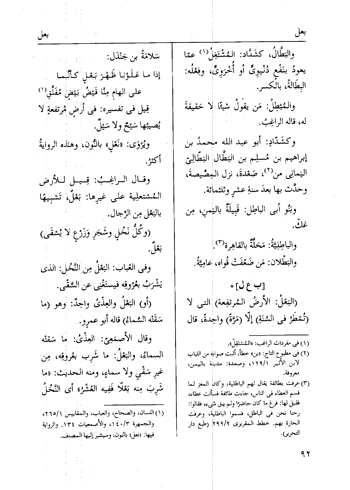 البَعْلُ: الأرضُ المُرتفِعة الَّتِي لَا تُمْطَرُ فِي السَّنَةِ إلاَّ مَرَّةً واحِدةً، قَالَ سَلامَةُ بن جَنْدَل: