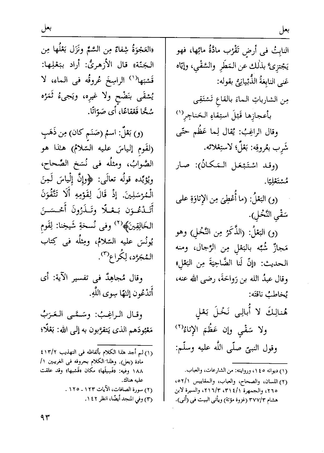 وَقَول النَّبِي صلّى اللَّه عَلَيْهِ وسلّم: العَجْوَةُ شِفاءٌ مِن السَّمِّ ونَزَل بَعْلُها مِن الجَنّة قَالَ الأزهريُّ: أَرَادَ ببَعْلِها: قَسْبَها الراسِخَ عُروقُه فِي المَاء، لَا يُسْقَى بنَضْحٍ وَلَا غيرِه، ويَجيءُ ثَمَرُه سُحّاً قَعْقاعاً، أَي صَوّاتاً. بَعْلٌ: اسمُ صَنَمٍ كَانَ مِن ذَهَبٍ لقَومِ إلياسَ عَلَيْهِ السّلامُ هَذَا هُوَ الصَّوابُ، ومثلُه فِي نُسَخ الصِّحاح، ويُؤيِّده قولُه تعالَى: وِإنَّ إِلْياسَ لَمِنَ الْمُرسَلِينَ. إذْ قَالَ لِقَوْمِهِ أَلَا تَتَّقُوَنَ أَتَدْعُوَن بَعْلاً وتَذَرُونَ أَحْسَنَ الخَالِقِينَ وَفِي نُسخةِ شَيخِنا: لِقَومِ يُونُسَ عَلَيْهِ السّلامُ، ومِثلُه فِي كِتاب المُجَرَّد، لِكُراع. وَقَالَ مُجاهِدٌ فِي تَفْسِير الْآيَة: أَي أَتدْعُون إِلَهًا سِوى اللَّهِ. وَقَالَ الراغِبُ: وسَمَّي العَرَبُ مَعْبُودَهم الَّذِي يَتقرَّبون بِهِ إِلَى الله: بَعْلاً