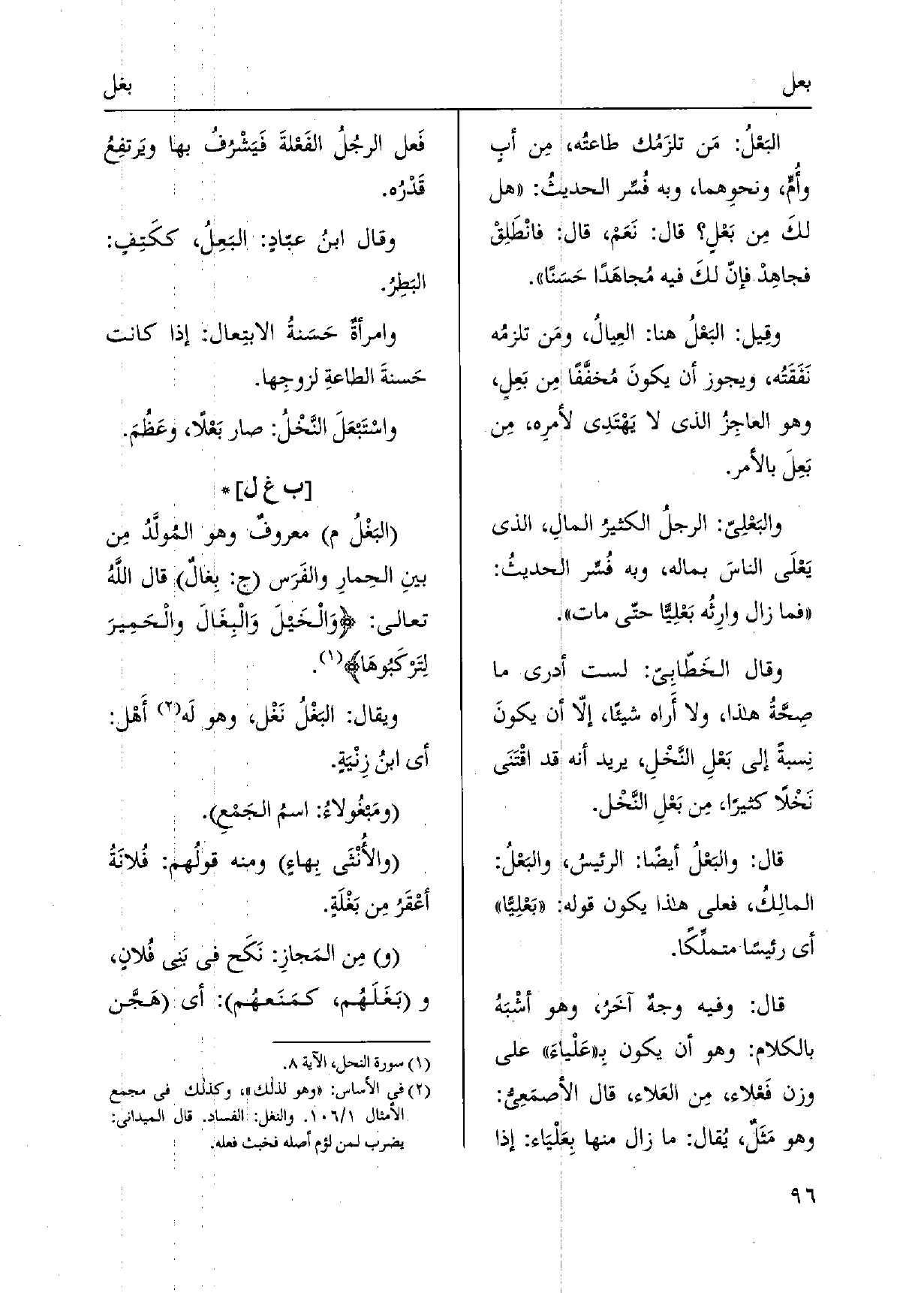 البَغْلُ م معروفٌ وَهُوَ المُولَّدُ مِن بينِ الحِمارِ والفَرَس ج: بِغالٌ قَالَ اللَّهُ تَعَالَى: وَالْخَيْلَ وَالْبِغَالَ والْحَمِيرَ لِتَركَبُوهَا. وَيُقَال: البَغْلُ نَغْل، وَهُوَ لَه أَهْل: أَي ابْن زِنْيَةٍ. ومَبْغُولاءُ: اسمُ الجَمْعِ.
