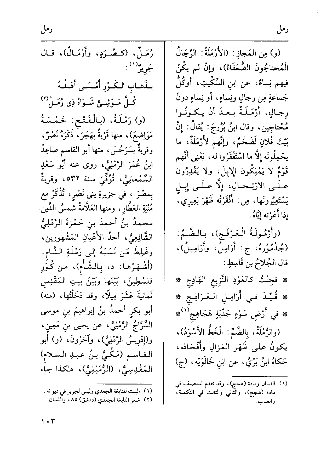 ومِن المَجازِ: الأَرْمَلَةُ: الرِّجالُ الْمُحتاجُونَ الضُّعَفاءُ، وإنْ لم يكُنْ فيهم نِساءٌ، عَن ابنِ السِّكِّيتِ، أَو كُلُّ جَماعةٍ مِن رجالٍ ونِساءٍ، أَو نِساءٍ دونَ رِجالٍ، أَرْمَلَةٌ بعدَ أَن يكونُوا مُحْتاجِين، وَقَالَ ابنُ بُزُرِجَ: يُقالُ: إنَّ بَيْتَ فُلانٍ لَضَخْمٌ، وإنُّهم لأَرْمَلَةٌ، مَا يحْمِلُونَه إِلاَّ مَا اسْتَفْقَرُوا لَهُ، يَعْنِي أنَّهم قَوْمٌ لَا يَمْلِكُون الإِبِلَ، وَلَا يَقْدِرُون علَى الارْتِحالِ، إِلاَّ علَى إبِلٍ يَسْتَعِيرُونَها، مِن: أَفْقَرْتُه ظَهْرَ بَعِيرِي، إِذا أَعَرْته إِيَّاهُ. وأُرْمُولَةُ الْعَرْفَج، بالضَّمِّ: جُذْمُورهُ، ج: أَرَامِلُ، وأَرامِيلُ، قَالَ الجُلاحُ بن قَاسِطٍ: فجِئْتُ كالعَوْدِ النَّزِيعِ الهَادِجِ قُيِّدَ فِي أَرَامِلِ العَرَافِجِ فِي أَرْضِ سَوْءٍ جَدْبَةٍ هَجاهِجِ والرُّمْلَةُ، بالضَّمِّ: الْخَطُ الأَسْوَدُ، يكونُ على ظَهْر الغزالِ وأَفْخاذه، حَكاهُ ابنُ بَرِّيٍّ، عَن ابنِ خَالَوَيْه، ج رُمَلٌ، كصُرَدٍ، وأَرْمَالٌ، قَالَ جَرِيرٌ: بذَهابِ الكَوْرِ أَمْسَى أَهْلُهُكُلَّ مَوْشِيٍّ شَواهُ ذِي رُمَلْ ورَمْلَةُ، بالْفَتْحِ: خَمْسَةُ مَواضِعَ، مِنْهَا قَرْيَةٌ بهَجَرَ، ذَكَرَهُ نَصْرٌ وقريَةٌ بسَرَخْسَ، مِنْهَا أَبُو الْقَاسِم صاعِدُ ابنُ عُمَرَ الرَّمْلِيُّ، روى عَنهُ أبُو سَعْدٍ السَّمْعانِيُّ، تُوُفِّيَ سنة، وقريةٌ بِمصْرَ، فِي جزيرةِ بني نَصْرٍ، تُذْكَرُ مَعَ مُنْيَةِ العَطَّارِ، وَمِنْهَا العَلاَّمةُ شمسُ الدّين محمدُ بنُ أحمدَ بنِ حَمْزَةَ الرَّمْلِيُّ الشَّافِعِيُّ، أحدُ الأَعْيانِ المَشْهُورِين، وغَلِطَ مَن نَسَبَهُ إِلَى رَمْلَةِ الشَّامِ. أَشْهَرُها: د، بِالشَّأْمِ، من كُوَرِ فلسْطِينَ، بَيْنَها وبَيْنَ بيتِ المَقْدِسِ ثَمانيةَ عَشَرَ مِيلاً، وَقد دَخَلْتُها، مِنْهُ أَبُو بكرٍ أحمدُ بنُ إِبراهيمَ بنِ مُوسَى السَّرَّاجُ الرَّمْلِيُّ، عَن يحيى بنِ مَعِينٍ، وإِدْرِيسُ الرَّمْلِيُّ، وآخَرُونَ، وَأَبُو الْقَاسِم مَكِّيُّ بنُ عبدِ السلامِ المَقْدِسِيُّ، الرُّمَيْلِيُّ، هَكَذَا جَاءَ
