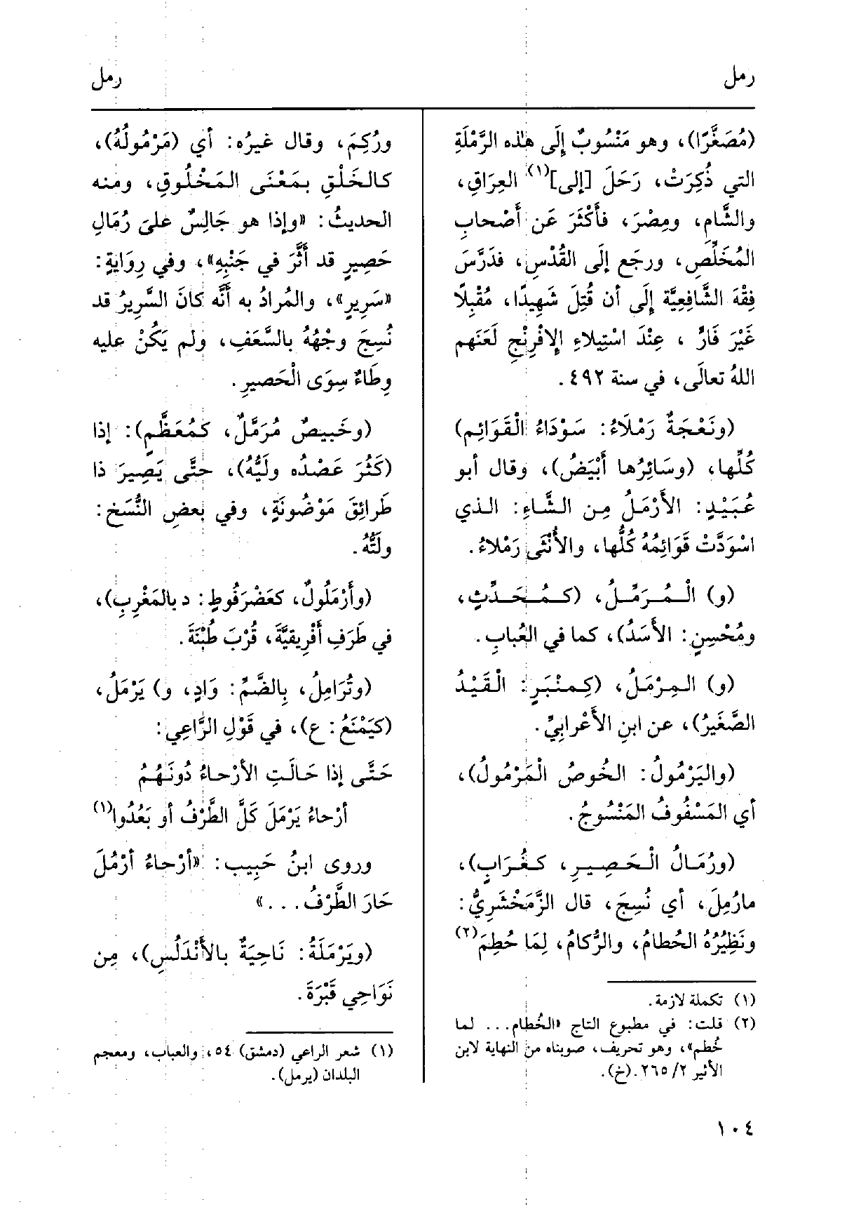 مُصَغَّراً، وَهُوَ مَنْسُوبٌ إِلَى هَذِه الرَّمْلَةِ الَّتِي ذُكِرَتْ، رَحَلَ إِلَى العِرَاقِ، والشَّامِ، ومِصْرَ، فأَكْثَرَ عَن أَصْحابِ المُخَلِّصِ، ورجَع إلَى القُدْسِ، فدَرَّسَ فِقْهَ الشَّافِعِيَّةِ إَلَى أَن قُتِلَ شَهِيداً، مُقْبِلاً غَيْرَ فَارّ، عِنْدَ اسْتِيلاء الإِفْرَنْجِ لَعَنَهم اللهُ تَعَالَى، فِي سنة. ونَعْجَةٌ رَمْلاَُ: سَوْدَاءُ الْقَوَائِم كُلِّها، وسَائِرُها أبْيَضُ، وَقَالَ أبُو عُبَيْدٍ: الأَرْمَلُ مِن الشَّاءِ: الَّذِي اسْوَدَّتْ قَوَائِمُهُ كُلُّها، والأُنْثَى رَمْلاءُ. والْمُرَمِّلُ، كمُحَدِّثٍ، ومُحْسِنٍ: الأَسَدُ، كَمَا فِي العُبابِ. والمِرْمَلُ، كمنْبَرٍ: الْقَيْدُ الصَّغِيرُ، عَن ابنِ الأَعْرابِيِّ. واليَرْمُولُ:)