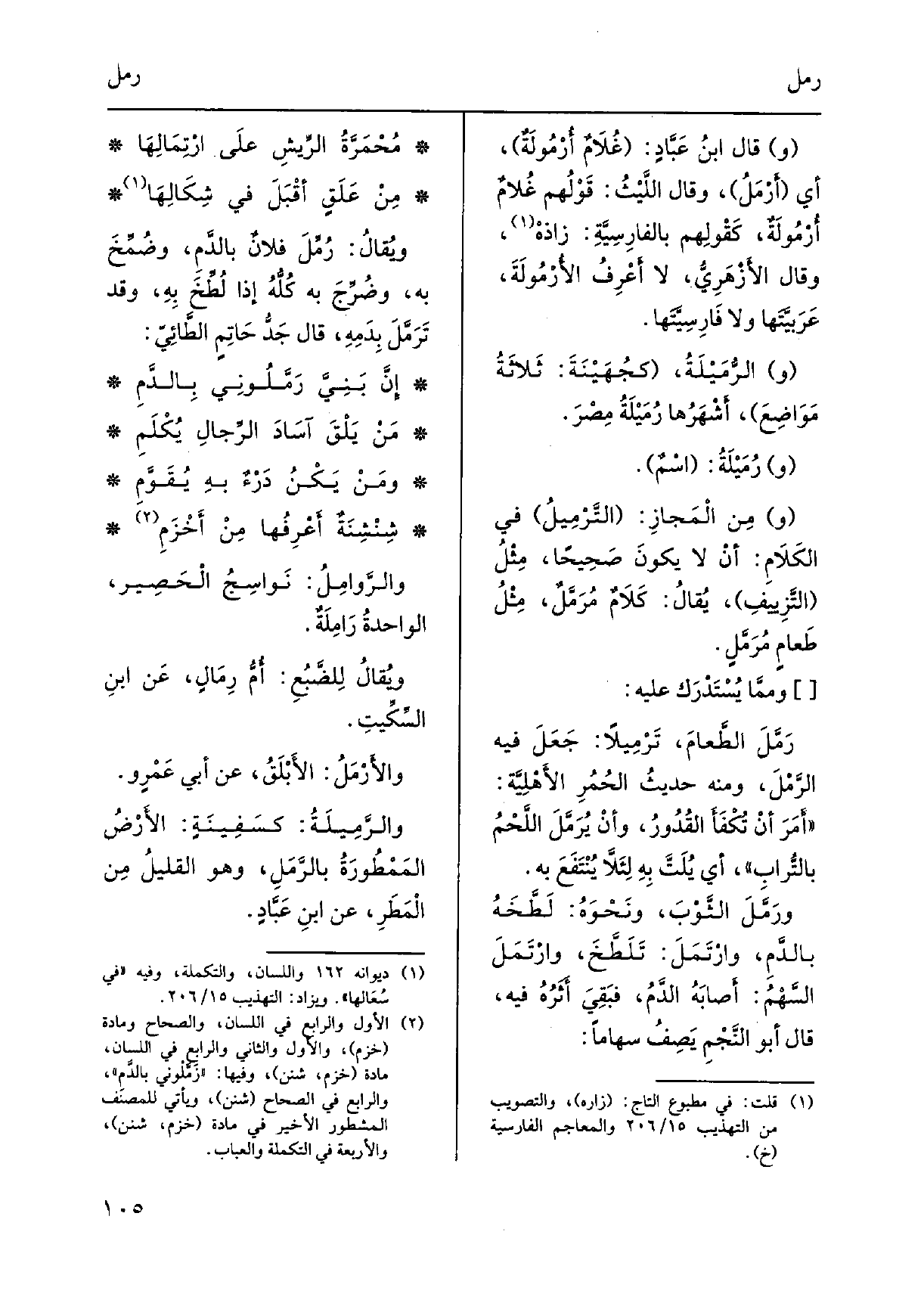 وَقَالَ ابْن، ُ عَبَّادٍ: غُلاَمٌ أُرْمُولَةٌ، أَي أَرْمَلُ، وَقَالَ اللَّيْثُ: قَوْلُهم غُلامٌ أُرْمُولَةٌ، كَقُولِهم بالفارِسِيَّةِ: زاذهْ، وَقَالَ الأَزْهَرِيُّ، لَا أَعْرِفُ الأُرْمُولَةَ عَرَبِيَّتَها وَلَا فَارِسِيَّتَها. والرُّمَيْلَةُ، كجُهَيْنَةَ: ثَلاثَةُ مَوَاضِعَ، أَشْهَرُها رُمَيْلَةُ مِصْرَ. ورُمَيْلَةُ: اسْمٌ. وَمن الْمجَاز: التَّرْمِيلُ فِي الكَلامِ، أَن لَا يكون صَحِيحاً، مِثْلُ التَّزِييفِ، يُقالُ: كَلامٌ مُرَمَّلٌ، مِثْلُ طَعامٍ مُرَمَّلٍ. وممّا يُسْتَدْرَكُ عَلَيْهِ: رَمَّلَ الطَّعامَ، تَرْمِيلاً: جَعَلَ فِيهِ الرَّمْلَ، وَمِنْه حديثُ الحُمُرِ الأَهْلِيَّةِ: أَمَرَ أنْ تُكْفَأَ القُدُورُ، وأنْ يُرَمَّلَ اللَّحْمُ بالتُّرابِ، أَي يُلتَّ بِهِ لِئَلاَّ يُنْتَفَعَ بِهِ. ورَمَّلَ الثَّوْبَ، ونَحْوُهُ: لَطَّخَهُ بالدَّمِ، وارْتَمَلَ: تَلَطَّخَ، وارْتَمَلَ السَّهْمُ: أَصابَهُ الدَّمُ، فَبَقِيَ أَثَرُهُ فِيهِ، قَالَ أَبُو النَّجْمِ يَصِفُ سهاماً: مُحْمَرَّةُ الرَّيشِ علَى ارْتِمَالِهَا مِنْ عَلَقٍ اقْبَلَ فِي شِكَالِهَا ويُقالُ: رُمِّلَ فُلانٌ بالدَّمِ، وضُمِّخَ بِهِ، وضُرِّجَ بِهِ كُلُّهُ إِذا لُطِّخَ بِهِ، وَقد تَرَمَّلَ بِدَمِهِ، قَالَ جَدُّ حَاتِمٍ الطَّائِيّ: إِذا بَنِيَّ رَمَّلُونِي بِالدَّمِ مَنْ يَلْقَ آسَادَ الرِّجال يُكْلَمِ ومَنْ يَكْنُ دَرْءٌ بهِ يُقَوَّمِ شِنْشِنَةٌ أَعْرِفُها مِنْ أخْزَمِ والرَّوامِلُ: نَواسِجُ الْحَصِير، الواحدةُ رَامِلَةٌ. ويُقالُ لِلضَبُعِ: أُمُّ رِمَالٍ، عَن ابنِ السِّكِّيتِ.)