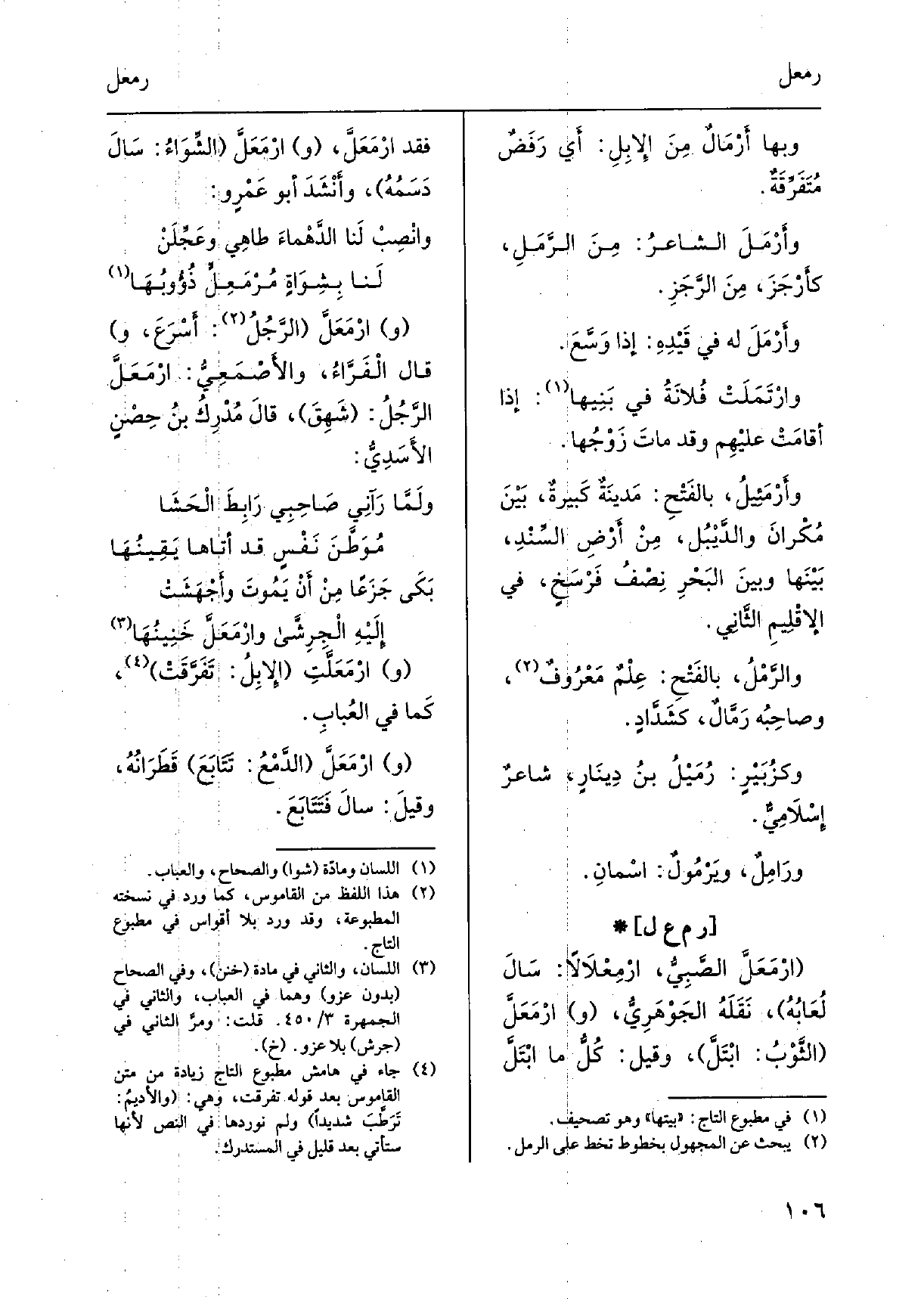 وَبهَا أَرْمَالٌ مِنَ الإبِلِ: أَي رَفَضٌ مُتَفَرِّقَةٌ. وأَرْمَلَ الشاعرُ: مِنَ الرَّمَلِ، كأَرْجَزَ، مِنَ الرَّجزِ. وأَرْمَلَ لَهُ فِي قَيْدِهِ: إِذا وَسَّعَ. وارْتَمَلَتْ فُلانَةُ فِي بَنِيها: إِذا أقامَتْ عليْهِم وَقد ماتَ زَوْجُها. وأَرْمَئِيلُ، بالفَتْحِ: مَدينَةٌ كَبيرةٌ، بَيْنَ مُكْرانَ والدَّيْبُل، مِنْ أَرْضِ السِّنْدِ، بَيْنَها وبينَ البَحْرِ نِصْفُ فَرْسَخٍ، فِي الإقْلِيمِ الثَّانِي. والرَّمْلُ، بالفَتْحِ: عِلْمٌ مَعْرُوفٌ، وصاحِبُه رَمَّالٌ، كشَدَّادٍ. وكزُبَيْرٍ: رُمَيْلُ بنُ دِينَارٍ، شاعرٌ إِسلاَمِيٌّ. ورَامِلٌ، ويَرْمُولٌ: اسْمانِ.
