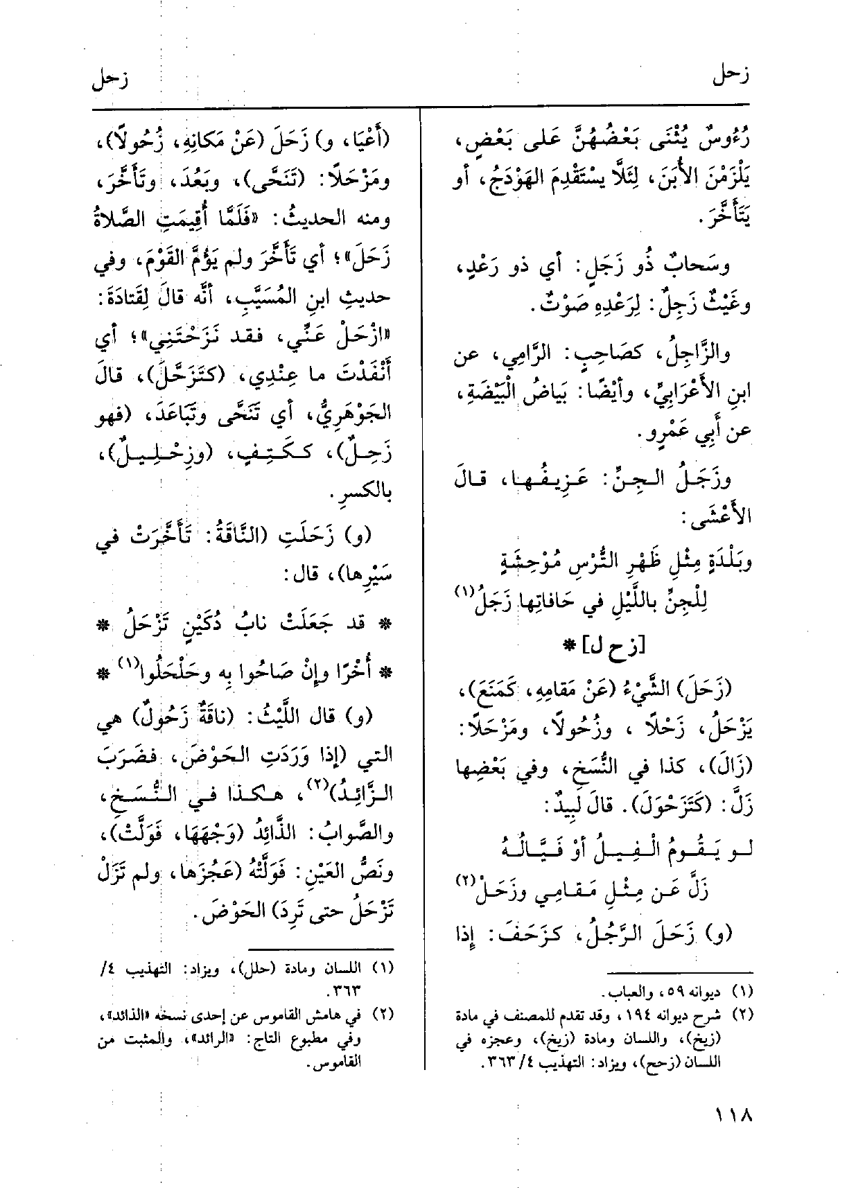 وزَحَلَ الرَّجُلُ، كزَحَفَ: إِذا أَعْيَا، وزَحَلَ عَنْ مَكانِهِ، زُحُولاً، ومَزْحَلاً: تَنَحَّى، وبَعُدَ، وتَأَخَّرَ، وَمِنْه الحديثُ: فَلَمَّا أُقِيمَتِ الصَّلاةُ زَحَلَ، أَي تَأَخَّرَ وَلم يَؤُمَّ القَوْمَ، وَفِي حديثِ ابنِ المُسَيَّبِ، أنَّهُ قالَ لِقَتادَةَ: ازْحَلْ عَنِّي، فقد نَزَحْتَنِي، أَي أَنْفَدْتَ مَا عِنْدِي، كتَزَحَّلَ، قالَ الجَوْهَرِيُّ، أَي تَنَحَّى وتَبَاعَدَ، فَهُوَ زَحِلٌ، ككَتِفٍ، وزِحْلِيلٌ، بالكسرِ. وزَحَلَتِ النَّاقَةُ: تَأَخَّرَتْ فِي سَيْرِها، قَالَ: قد جَعَلَتْ نابُ دُكَيْنٍ تَزْحَلُ أُخْراً وإِنْ صَاحُوا بِهِ وحَلْحَلُوا وَقَالَ اللَّيْثُ: ناقَةٌ زَحُولٌ هِيَ الَّتِي إِذا وَرَدَتِ الحَوْضَ، فضَرَبَ الزَّائِدُ، هَكَذَا فِي النُّسَخِ، والصَّوابُ: الذَّائِدُ وَجْهَهَا، فَوَلَّتْ، ونَصُّ العَيْنِ: فَوَلَّتْهُ عَجُزَها، وَلم تَزَلْ تَزْحَلُ حَتَّى تَرِدَ الحَوْضَ.