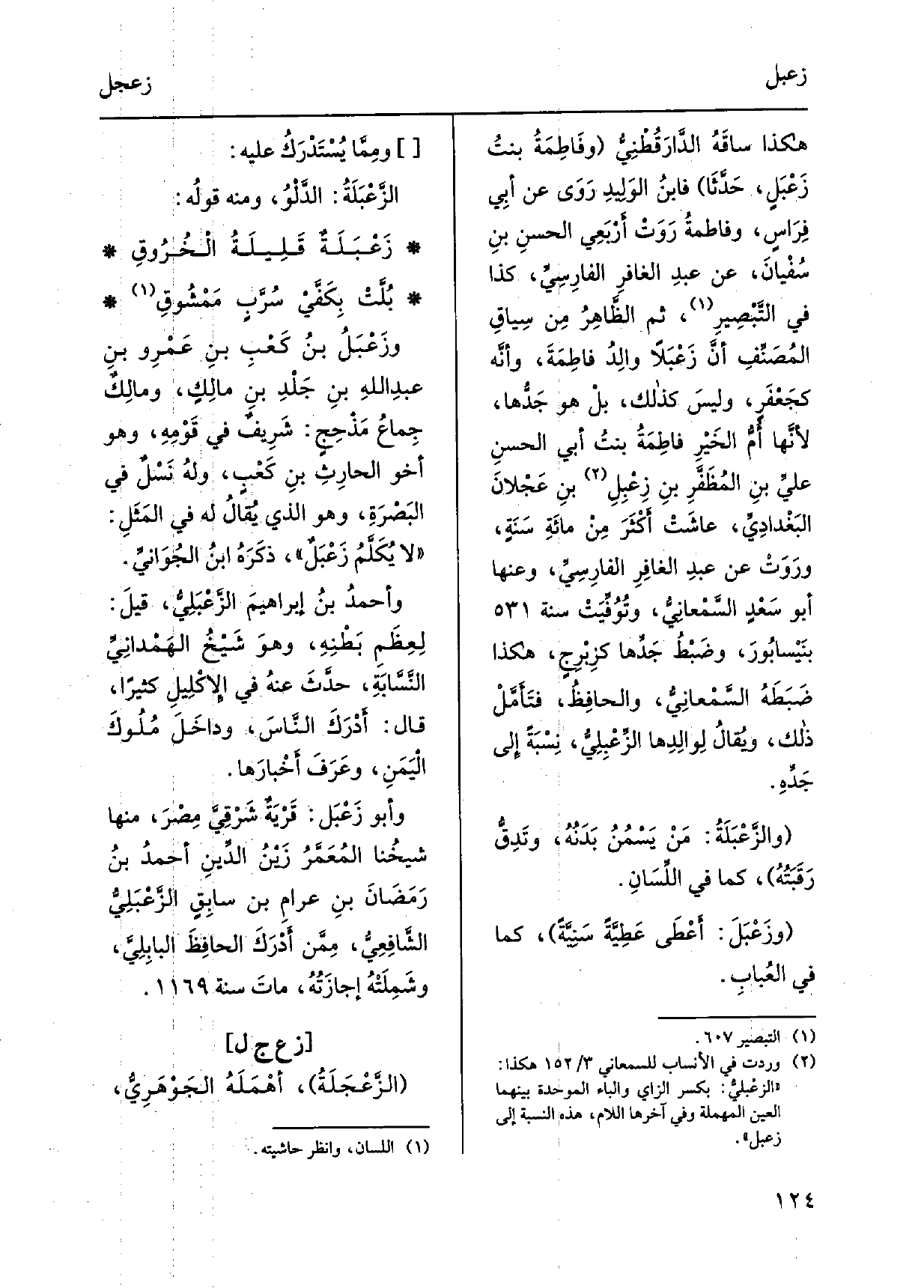هَكَذَا ساقَهُ الدَّارَقُطْنِيُّ وفَاطمَةُ بنتُ زَعْبَلٍ، حَدَّثَا فابنُ الوَلِيدِ رَوَى عَن أبِي فِرَاسٍ، وفاطمةُ رَوَتْ أَرْبَعِي الحسنِ بنِ سُفْيانَ، عَن عبدِ الغافرِ الفارِسِيِّ، كَذَا ف التَّبْصِيرِ، ثمَّ الظَّاهِرُ مِن سِياقِ المُصَنِّفِ أنَّ زَعْبَلاً والِدُ فاطِمَةَ، وأنَّه)