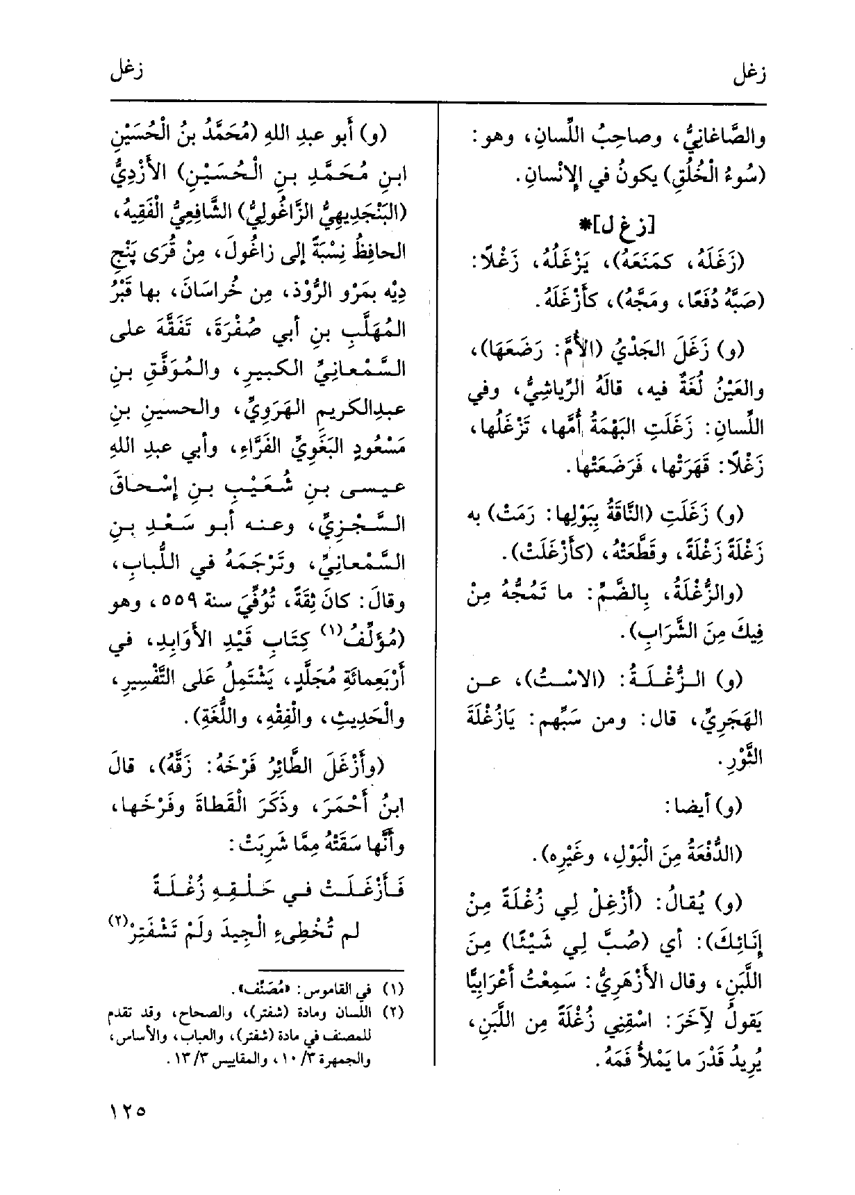 وزَغَلَتْ النَّاقَةُ بِبَوْلِها: رَمَتْ بِهِ زَغْلَةً زَغْلَةً، وقَطَّعَتْهُ، كأَزْغَلَتْ. والزُّغْلَةُ، بَالضَّمِّ: مَا تَمُجُّهُ مِنْ فِيكَ مِنَ الشَّرَابِ. والزُّغْلَةُ: الاسْتُ، عَن الهَجَرِيُّ، قَالَ: وَمن سَبِّهم: يَا زُغْلَةُ الثَّوْرِ. وأَيْضاً: الدُّفعَةُ من البَوْلِ، وغَيْرِه. ويُقال أَزْغِلْ لِي زُغْلَةً مِنْ إِنائِكَ: أَي صُبَّ لِي شَيْئاً مِنَ اللَّبَنِ، وَقَالَ الأَزْهَرِيُّ: سَمِعْتُ أَعْرَابِيّاً يَقولُ لآخَرَ: اسْقِنِي زُغْلَةً مِن اللَّبَنِ، يُرِيدُ قَدْرَ مَا يَمْلأُ فَمَهُ. وأَبو عُبدِ اللهِ مُحَمَّدُ بنُ الْحُسَيْنِ ابنِ مُحَمَّدِ بنِ الْحُسَيْنِ الأَزْدِيُّ البَنْجَدِيهِيُّ الزَّاغُولِيُّ الشَّافِعِيُّ الْفَقِيهُ، الحافِظُ نِسْبَةً إِلَى زاغُولَ، مِنْ قُرَى بنْجِ دِيْه بمَرْو الرُّوْذ، مِن خُراسَانَ، بهَا قَبْرُ المهَلَّبِ بنِ أَبى صُفْرَةَ، تَفَقَّهَ على السَّمْعانِيِّ الكبيرِ، والمُوَفَّقِ بنِ عبدِ الكريمِ الهَرَوِيِّ، والحسينِ بنِ مَسْعُودٍ البَغَوِيِّ الفَرَّاءِ، وَأبي عبدِ اللهِ عِيسَى بنِ شُعَيْبِ بنِ إِسْحاقَ الَّسَجْزِيِّ، وَعنهُ أَبُو سَعْدِ بنِ السَّمْعانِيِّ، وتَرْجَمَهُ فِي اللُّبابِ، وقالَ: كانَ ثِقَةً، تُوُفِّيَ سنة، وَهُوَ مُؤَلِّفُ كِتَابِ قَيْدِ الأَوِابِدِ، فِي أَرْبَعِمائَةِ مُجَلَّدٍ، يَشْتَمِلُ عَلى التَّفْسِيرِ، والْحَدِيثِ، والْفِقْهِ، واللُّغَةِ. وأَزْغَلَ الطَّائِرُ فَرْخَهُ: زَقَّهُ، قالَ ابنُ أَحْمَرَ، وذَكَرَ الْقَطاةَ وفَرْخَها، أَنَّها سَقَتْهُ مِمَّا شَرِبَتْ: