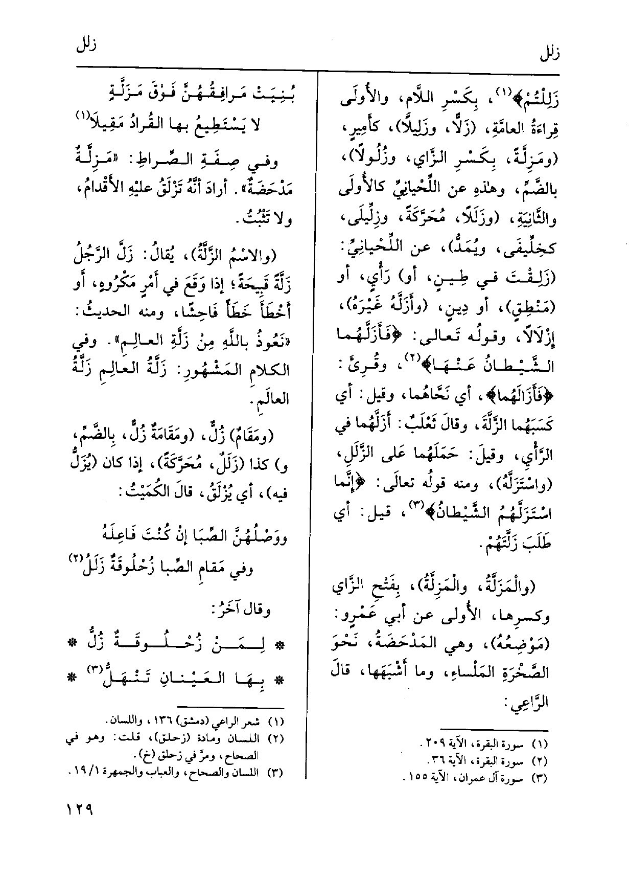 {زَلِلْتُمْ، بِكَسْرِ اللَّامِ، والأُولَى قِراءَةُ العامَّةِ،} زَلاًَّ، {وزَلِيلاً، كأَمِيرٍ،} ومَزِلَّةً، بِكَسْرِ الزَّاي، {وزُلُولاً، بالضَّمِّ، وهذهِ عَن اللِّحْيانِيِّ كالأُولَى والثَّانِيَةِ،} وزَلَلاً، مُحَرَّكَةً، {وزِلِّيلَى، كخِلِّيفَى، ويُمَدُّ، عَن اللِّحْيانِيِّ: زَلِقْتَ فِي طِينٍ، أَو رَأيٍ، أَو مَنْطِقٍ، أَو دِينٍ،} وأَزَلَّهُ غَيْرَهُ، {إِزْلاَلاً، وقولُه تَعالى:} فَأَزَلَّهُما الشَّيْطانُ عَنْهَا، وقُرِئَ: فَأَزَالَهُما، أَي نَحَّاهُما، وَقيل: أيكَسَبَهُما {الزَّلَّةَ، وقالَ ثَعْلَبٌ:} أَزَلَّهُما فِي الرَّأْيِ، وقيلَ حَمَلُهما عَلى {الزَّلَلِ،} واسْتَزَلَّهُ، وَمِنْه قولُه تعالَى: إِنَّما {اسْتَزَلُّهُمُ الشَّيْطانُ، قيل: أَي طَلَبَ زَلَّتَهُمْ.