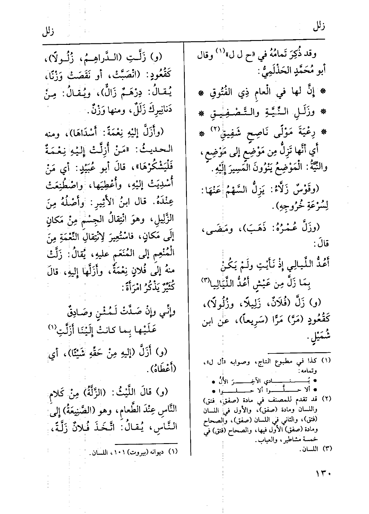 وَقد ذُكِرَ تَمامُهُ فِي ح ل ل وَقَالَ أَبو مُحَمَّدٍ الحّذْلَمِيُّ: إنَّ لَهَا فِي الْعامِ ذِي الفُتُوقِ {وزَلَلِ النِّيَّةِ والتَّصْفِيقِ رِعْيَةً مَوْلىً نَاصِحٍ شَفِيْقِ أَيْ أنَّها} تَزِلُّ مِن مَوْضِعٍ إِلَى مَوْضِعٍ، والنّيَّةُ: الْمَوْضِعُ يَنْوُونَ المَسِيرَ إِلَيْهِ. وقَوْسٌ {زَلاَّءُ: يَزِلُّ السَّهْمُ عَنْهَا: لِسُرْعَةِ خُرُوجِهِ.} وزَلَّ عُمْرُهُ: ذَهَبَ، ومَضَى، قالَ: