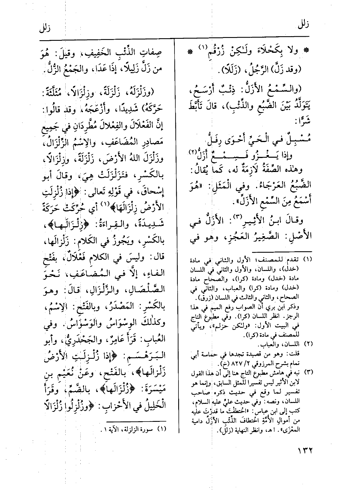 وقالَ ابنُ الأَثِيرِ: {الأَزَلُّ فِي الأَصْلِ: الصَّغِيرُ العَجُزِ، وَهُوَ فِي صِفاتِ الّذِئْبِ الخَفِيفِ، وقيلَ: هُوَ من} زَلَّ {زَليِلاً، إذَا عَدَا، والجَمْعُ} الزُّلُّ. {وزَلْزَلَهُ،} زَلْزَلَةً، {وزِلْزَالاً، مُثَلَّثَةً: حَرَّكَهُ شَدِيداً، وأَزْعَجَهُ، وَقد قالُوا: إنَّ الفَعْلاَلَ والفِعْلالَ مُطَّرِدَانِ فِي جَمِيعِ مَصادِرِ المُضَاعَفِ، والاسْمُ} الزِّلْزَالُ، {وزَلْزَلَ اللهُ الأَرْضَ،} زَلْزَلَةً، وزِلْزَالاً، بالكَسْرِ، فتَزَلْزَلَتْ هِيَ، وقالَ أَبُو إِسْحاقَ، فِي قَوْلِهِ تَعالى: إِذا {زُلْزِلَتِ الأَرْضُ} زِلْزَالَهَا أَي حُرِّكَتْ حَرَكَةً شَدِيدَةً، والقِراءَةُ: {زِلْزَالَها، بالكَسْرِ، ويَجُوزُ فِي الكَلامِ:} زَلْزالَها، قَالَ: وليسَ فِي الكلامِ فَعْلاَلٌ، بفَتْحِ الفاءِ، إلاَّ فِي المُضاعَفِ، نَحْوَ الصَّلْصَالِ، {والزَّلْزَالِ، قالَ: وهوَ بالكَسْرِ: المَصْدَرُ، وبالفَتْحِ: الِسْمُ، وكذلكَ الوِسْوَاسُ والوَسْوَاسُ. وَفِي)