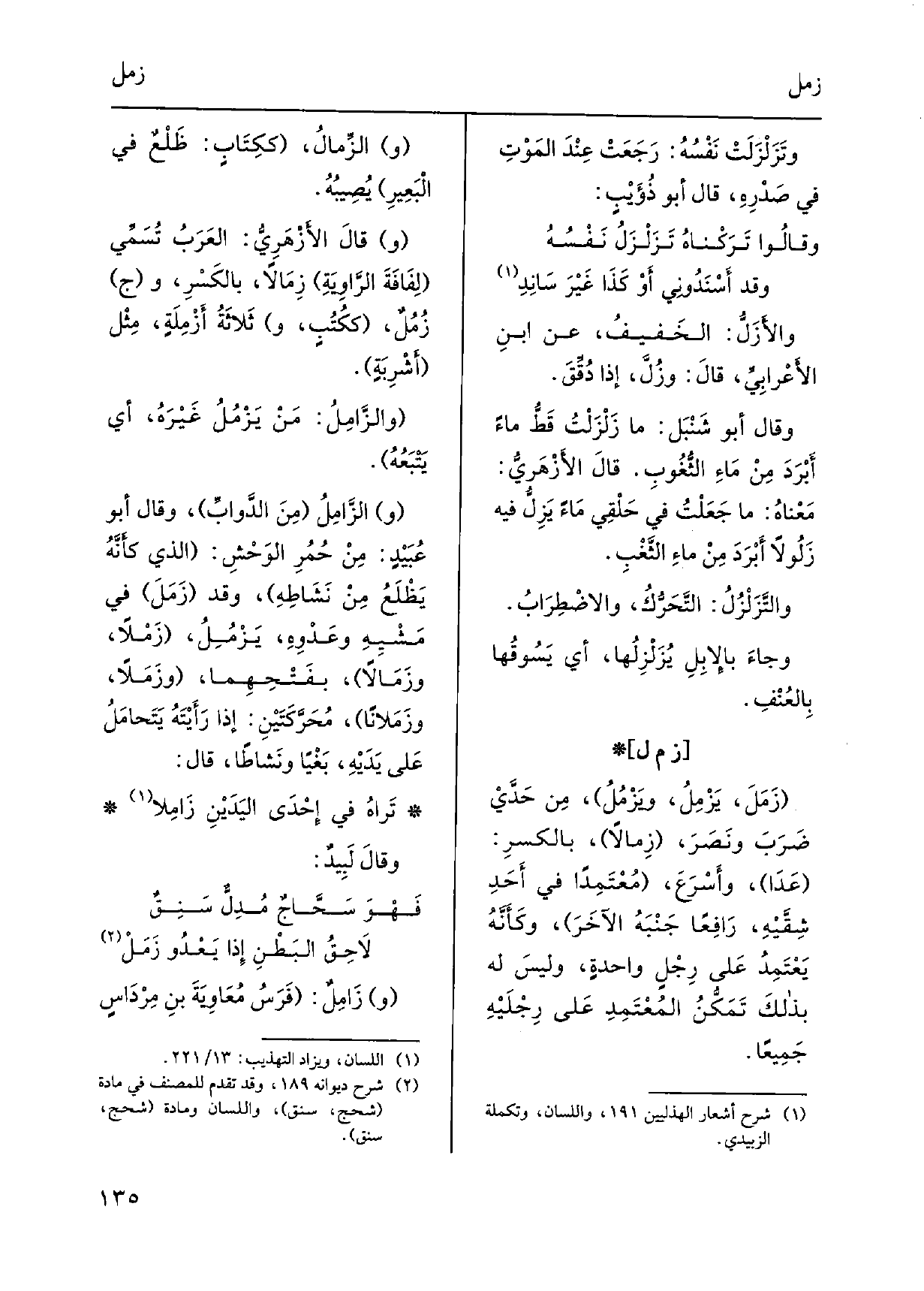 زَمَلَ، يَزْمِلُ، ويَزْمُلُ، مِن حَدَّيْ ضَرَبَ ونَصَرَ، زِمالاً، بالكسرِ: عَدَا، وأَسْرَعَ، مُعْتَمِداً فِي أَحَدِ شِقَّيْهِ، رَافِعاً جَنْبَهُ الآخَرَ، وكَأَنَّهُ يَعْتَمِدُ عَلى رِجْلٍ واحِدةٍ، وليسَ لَهُ بذلك تَمَكُّنُ المُعْتَمِدِ عَلى رِجْلَيْهِ جَمِيعاً. والزِّمالُ، ككِتَابٍ: ظَلْعٌ فِي الْبَعِيرِ يُصِيبُهُ. وقالَ الأَزْهَرِيُّ: العَرَبُ تُسَمِّي لِفَافَةَ الرّاوِيَةِ زِمَالاً، بالكَسْرِ، وَج زُمُلٌ، ككُتُبٍ، وثَلاثَةُ أَزْمِلَةٍ، مِثْل أَشْرِبَةٍ. والزَّامِلُ: مَنْ يَزْمُلُ غَيْرَهُ، أَي يَتْبَعُهُ. والزَّامِلُ مِنَ الدَّوابِّ، وَقَالَ أَبُو عُبَيْدٍ: مِنْ حُمُرِ الوَحْشِ: الَّذِي كأَنَّهُ يَظْلَعُ مِنْ نَشاطِهِ، وَقد زَمَلَ فِي مَشْيِهِ وعَدْوِهِ، يَزْمُلُ، زَمْلاً، وزَمَالاً، بلفَتْحَهِما، وزَمَلاً وزَمَلاناً، مُحَرَّكَتَيْنِ: إِذا رَأَيْتَهُ يَتَحامَلُ عَلى يَدَيْهِ، بَغْياً ونَشاطاً، قَالَ: تَراهُ فِي إِحْدَى اليَدَيْنِ زَامِلا وقالَ لَبِيدٌ: