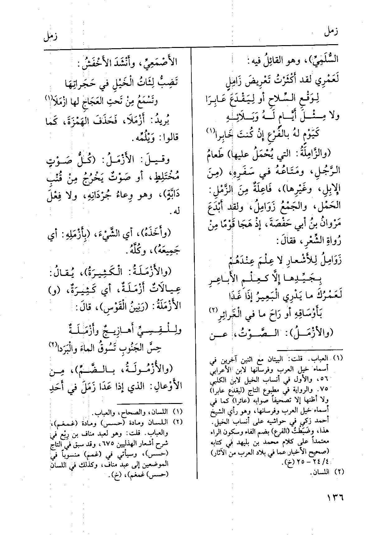 والزَّامِلَةُ: الَّتِي يُحْمَلُ عَلَيْهَا طَعامُ الرَّجُلِ، ومَتَاعُهُ فِي سَفَرِهِ، مِنَ الإِبِلِ، وغَيْرِها، فَاعِلَةٌ مِنَ الزَّمْلِ: الحَمْل، والجَمْعُ زَوَامِلُ، وَلَقَد أَبْدَعَ مَرْوانُ بنُ أبي حَفْصَةَ، إذْ هَجَا قَوْماً مِنْ رُواةِ الشِّعْرِ، فقالَ:)
