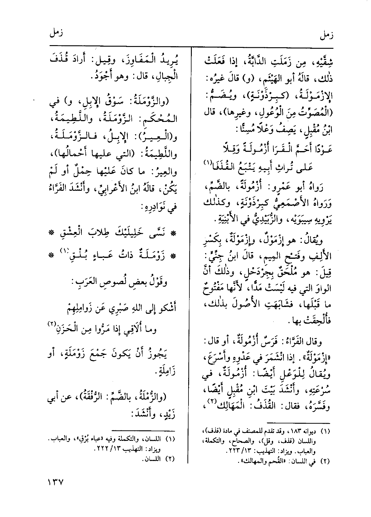 رَواهُ أَبُو عَمْرٍ و: أُزْمُولَةً، بالضَّمِّ، وَرَواهُ الأَصْمَعِيُّ كبِرْذَوْنَةٍ، وَكَذَلِكَ يَرْوِيهِ سِبَوَيْه، والزُّبَيْدِيُّ فِي الأَبْنِيَة. ويُقالُ: هُوَ إِزْمَوْلٌ، وإِزْمَوْلَةٌ، بِكَسْرِ الأَلِفِ وفَتْحِ المِيمِ، قالَ ابنُ جِنِّيٍّ: قِيلَ: هُوَ مُلْحَقٌ بِجِرْدَحْلٍ، وذلكَ أنَّ الواوَ الَّتِي فِيهِ لَيْسَتْ مَدّاً، لأَنَّها مَفْتُوحٌ مَا قَبْلَها، فَشَابَهَتٍِ الأُصُولَ بذلك، فأُلْحِقَتْ بهَا. وَقَالَ الفَرَّاءُ: فَرَسٌ أُزْمُولَةٌ، أَو قَالَ: إِزْمَوْلَةٌ. إِذا انْشَمَرَ فِي عَدْوِهِ وأَسْرَعَ، ويُقالُ لِلْوَعْلِ أَيْضاً. أُزْمُولَةٌ، فِي سُرْعَتِهِ، وأَنْشَدَ بَيْتَ ابْنِ مُقْبِلٍ أَيْضاً، وفَسَّرَهُ، فَقَالَ: القُذَفُ: الْمَهَالِك، يُرِيدُ الْمَفَاوِزَ، وقِيل: أَرادَ قُذَفَ الْجِبالِ، قَالَ: وَهُوَ أَجْوَدُ. والزَّوْمَلَةُ: سَوْقُ الإِبِلِ، وَفِي المُحْكَمِ: الزَّوْمَلَةُ، واللَّطِيمَةُ، والْعِيرُ: الإِبِلُ، فالزَّوْمَلَةُ، واللَّطِيمَةُ: الَّتِي عَلَيْهَا أحْمالُها، والعِيرُ: مَا كانَ عَليْها جَمَلٌ أَو لَمْ يَكُنْ، قالَهُ ابنُ الأَعْرابِيِّ، وأَنْشَدَ الفَرَّاءُ فِي نَوادِرِه: نَسَّى خَلِيلَيْكَ طِلابَ الْعِشْقِ زَوْمَلَةٌ ذاتُ عَباءٍ بُلْقِ وقَوْلُ بعَضِ لُصوصِ العَرَبِ: