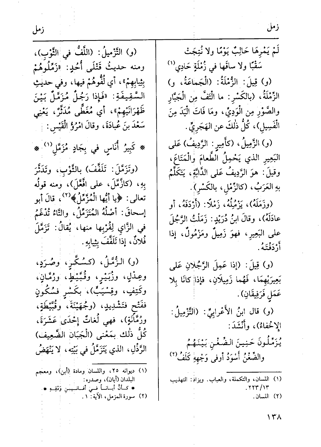 والتَّزْميلُ: اللّفُّ فِي الثَّوْبِ، وَمِنْه حديثُ قَتْلَى أُحُدٍ: زَمِّلُوهُمْ بِثِيابِهِمْ، أَي لُفُّوهُمْ فِيهَا، وَفِي حديثِ السَّقِيفَةِ: فَإِذا رَجُلٌ مُزَمَّلٌ بَيْنَ ظَهْرَانَيْهِمْ، أَي مُغَطَّى مُدَثَّرٌ، يَعْنِي سَعْدَ بنَ عبُادَةَ، وقالَ امْرُؤُ الْقَيْسِ: كَبِيرُ أُنَاسٍ فِي بِجَادٍ مُزَمَّلِ وتَزَّمَّلأَ: تَلَفَّفَ بالثَّوْبِ، وتَدَثَّرَ بِهِ، كازَّمَّلَ، على افَّعَّلَ، وَمِنْه قولُه تَعَالَى: يَا أيُّها الْمُزَّمِّلُ، قالَ أَبُو إسحاقَ: أصْلُهُ المُتَزَمِّلُ، والتَّاءُ تُدْغَمُ فِي الزَّايِ لِقُرْبِها مِنْهَا، يُقالُ: تَزَمَّلَ فُلانٌ، إِذا تَلَفَّفَ بِثِيابِهِ. والزُّمَّلُ، كسُكَّرٍ، وصُرَدٍ، وعِدْلٍ، وزُبَيْرٍ، وقُبَّيْطٍ، ورُمَّانٍ، وكَتِفٍ، وقِسْيَبٍ، بكَسْرٍ فسُكُونٍ ففَتْحٍ فتَشْدِيدٍ، وجُهَيْنَةَ، وقُبَّيْطَةٍ، ورُمَّانَةٍ، فَهِيَ لُغاتٌ إِحْدَى عَشَرَةَ، كُلُّ ذَلِك بمَعْنى الْجَبَان الضَّعِيف الرَّذْلِ، الَّذِي يَتَزَمَّلُ فِي بَيْتِه، لَا يَنْهَضُ