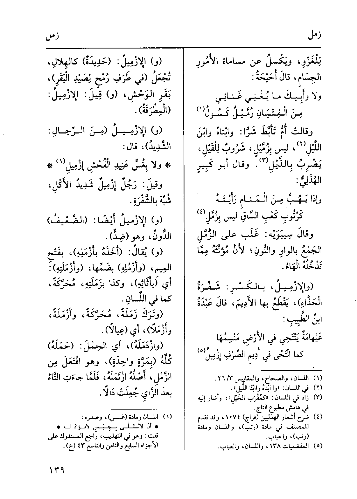 وقالَ سِيبَوَيْه: غَلَب على الزُّمَّلِ الجَمْعُ بالواوِ والنُّونِ، لأَنَّ مُؤَنَّثَهُ مِمَّا تَدْخُلُه الْهاءُ. والإِزْمِيلُ، بالكَسْرِ: شَفْرَةُ الْحَذَّاءِ، يَقْطَعُ بهَا الأَدِيمَ، قالَ عَبْدَةُ ابنُ الطَّبِيبِ: