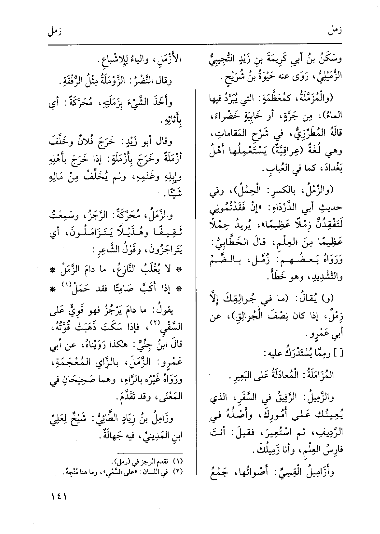والزَّمَلُ، مُحَرَّكَةً: الرّجَزُ، وسَمِعْتُ ثَقِيفاً وهُذَيْلاً يَتَزَامَلُونَ، أَي يَتَراجَزُونَ، وقَوْلُ الشَّاعِرِ: لَا يُغْلَبُ النَّازِعُ، مادامَ الزَّمَلْ إِذا أَكَبَّ صَامِتاً فقد حَمَلْ يقولُ: مَا دامَ يَرْجُزُ فَهُوَ قَوِيٌّ عَلى السَّقْيِ، فَإِذا سَكَتَ ذَهَبَتْ قُوَّتُهُ، قالَ ابنُ جِنِّيٍّ: هَكَذَا رَوَيْناهُ، عَن أبي عَمْرٍ و: الزَّمَلَ، بالزَّاي المُعْجَمَةِ، ورَوَاهُ غَيْرُه بالرَّاءِ، وهُمَا صَحِيحَانِ فِي المَعْنَى، وَقد تَقَدَّمَ. وزَامِلُ بنُ زِيَادٍ الطَّائِيُّ: شَيْخٌ لِعَلِيِّ ابنِ المَدِينِيِّ، فِيهِ جَهالَةٌ.