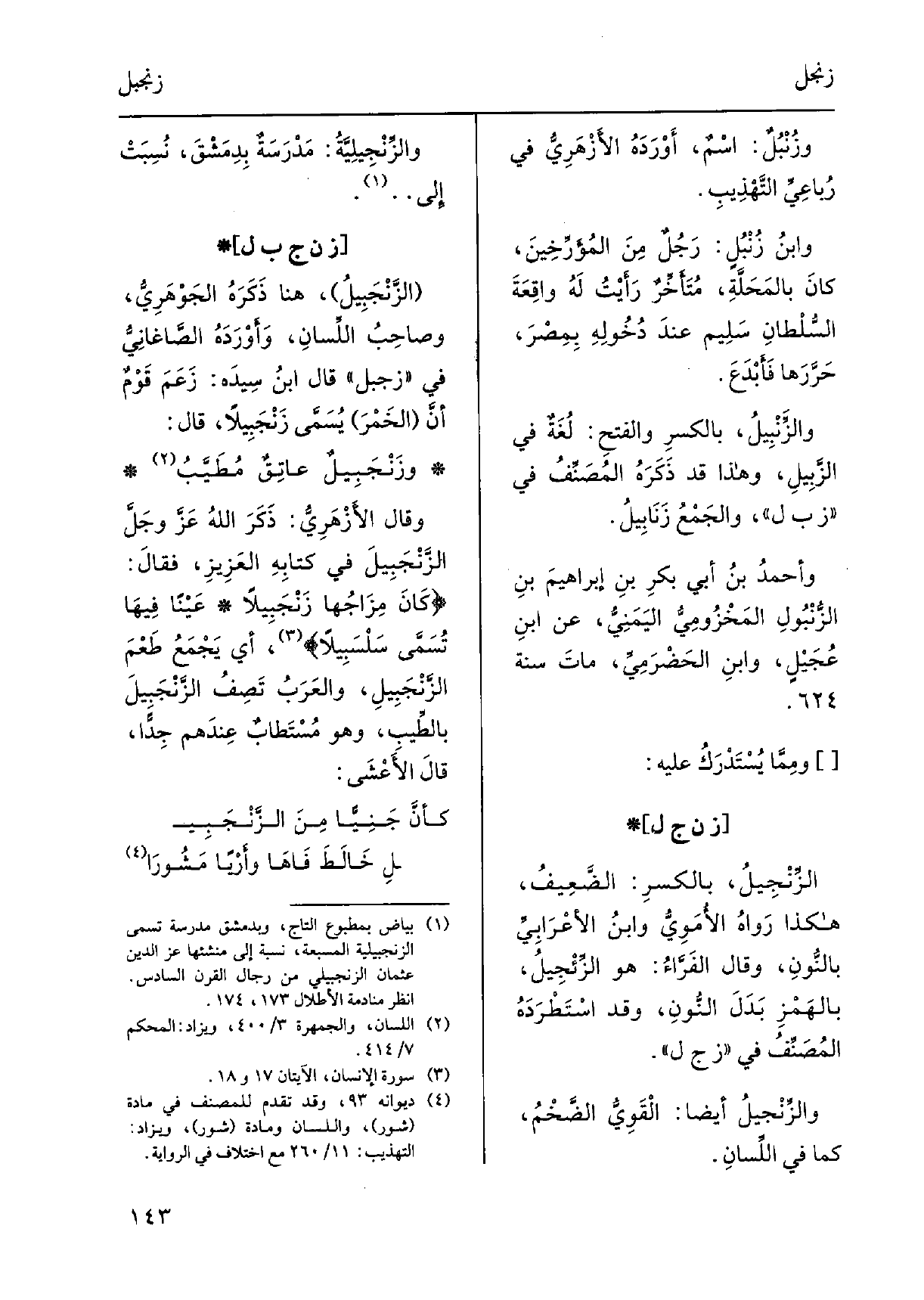 الزَّنْجَبِيلُ، هُنَا ذَكَرَهُ الجَوْهَرِيُّ، وصاحِبُ اللِّسانِ، وأَوْرَدَهُ الصّاغَانِيُّ فِي زجبل، قَالَ ابْن سيدَه: زَعَمَ قَوْمٌ أنَّ الخَمْرَ يُسَمَّى زَنْجَبِيلاً، قَالَ: وزَنْجَبِيلٌ عاتِقٌ مُطَيَّبُ وَقَالَ الأَزْهَرِيُّ: ذَكَرَ اللهُ عَزَّ وجَلَّ الزَّنْجبيلَ فِي كتابِهِ العَزِيزِ، فقالَ: كانَ مِزَاجُها زَنْجَبِيلاً، عَيْناً فِيهَا تُسَمَّى سَلْسَبِيلاً، أَي يَجْمَعُ طَعْمَ الزَّنْجَبِيلِ، والعَرَبُ تَصِفُ الزَّنْجَبِيلَ بالطِّيبِ، وَهُوَ مُسْتَطابٌ عِنْدَهُم جِدّاً، قالَ الأَعْشَى: