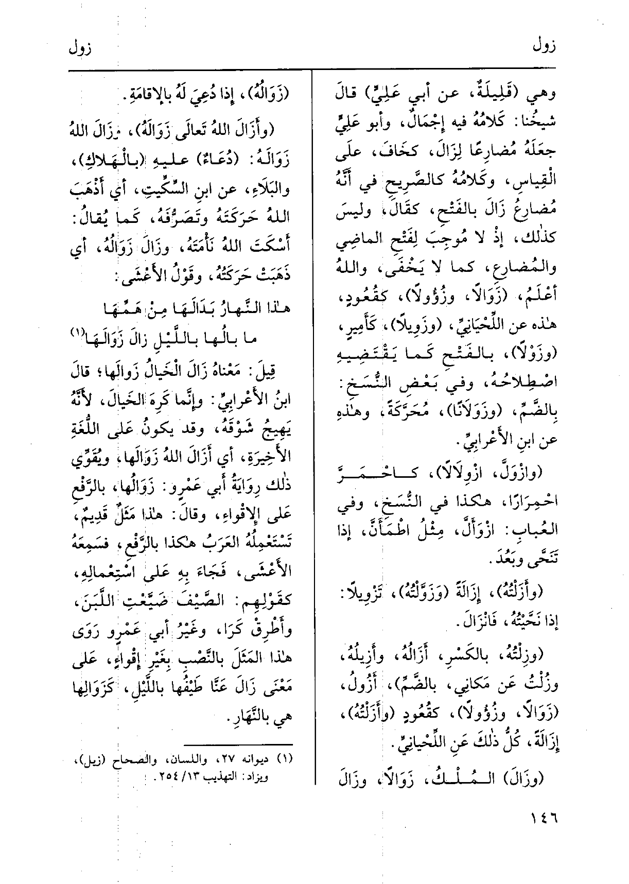 ذَلِك رِوَايَةُ أَبِي عَمْرٍ و: زَوَالُها، بالرَّفْعِ عَلى الإِقْواءِ، وقالَ: هَذَا مَثَلٌ قَدِيمٌ، تَسْتَعْمِلُهُ العَرَبُ هَكَذَا بالرَّفْعِ، فسَمِعَهُ الأَعْشَى، فَجَاءَ بِهِ عَلى اسْتِعْمالِهِ، كقَوْلِهِم: الصَّيْفَ ضَيَّعْتِ اللَّبَنَ، وأطْرِقْ كَرَا، وغَيْرُ أَبِي عَمْرٍ ورَوَى هَذَا المَثَلَ بالنَّصْبِ بِغَيْرِ إِقْواءٍ، عَلى مَعْنَى زَالَ عَنَّا طَيْفُها باللَّيْلِ،} كَزَوَالِها هِيَ بالنَّهَارِ.