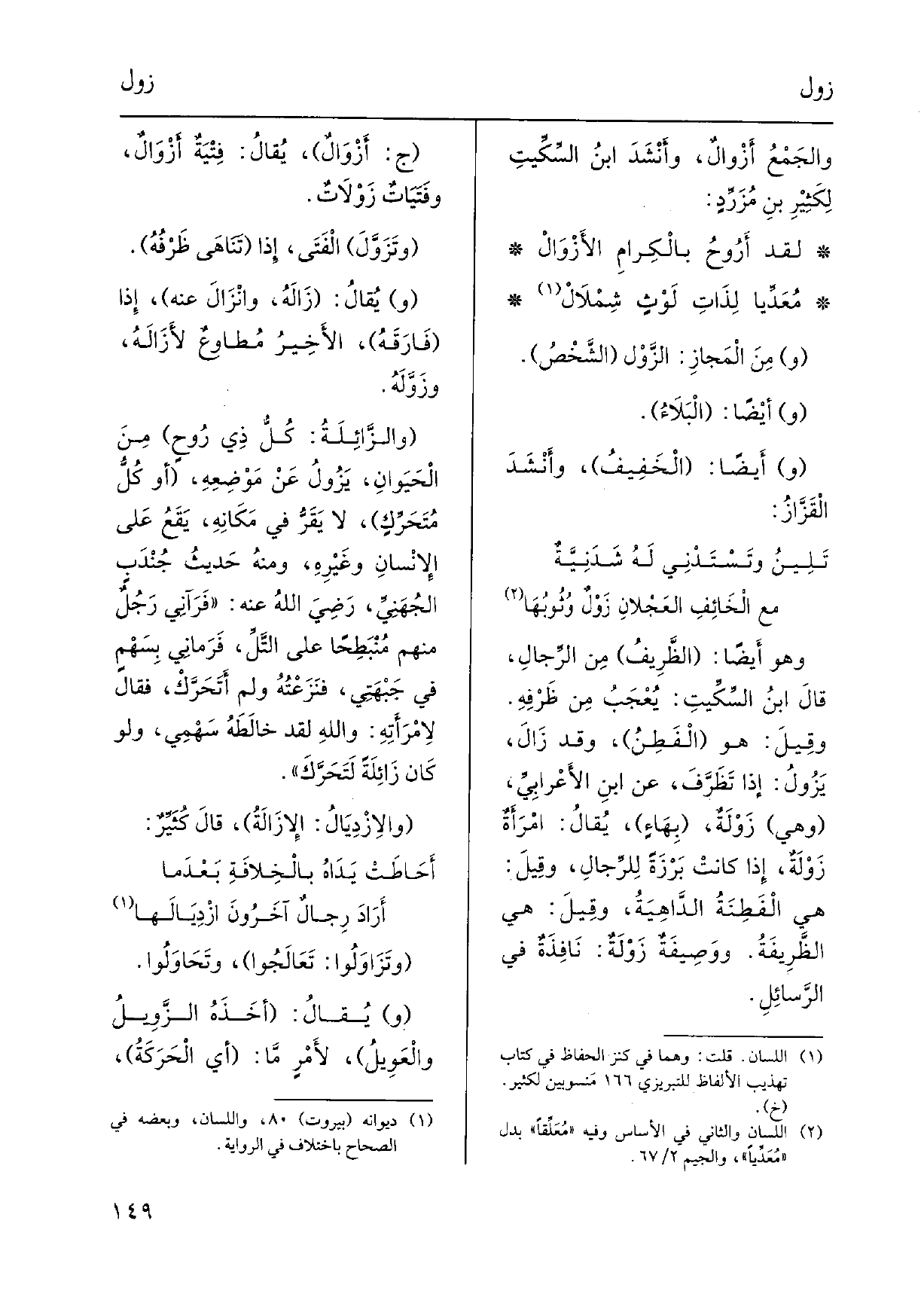 والجَمْعُ أَزْوالٌ، وأَنْشَدَ ابنُ السِّكِّيتِ لِكَثِيْرِ بن مَزَرِّدٍ: لقد أَروحُ بالكِرامِ {الأَزْوالْ مُعدِّياً لِذَاتِ لَوْثٍ شِمْلاَلْ ومِنَ الْمَجازِ: الزَّوْل الشَخْصُ. وأَيْضاً: البَلاَءُ. وأَيضاً: الْخَفِيفُ، وأَنْشَدَ الْقَزَّازُ: