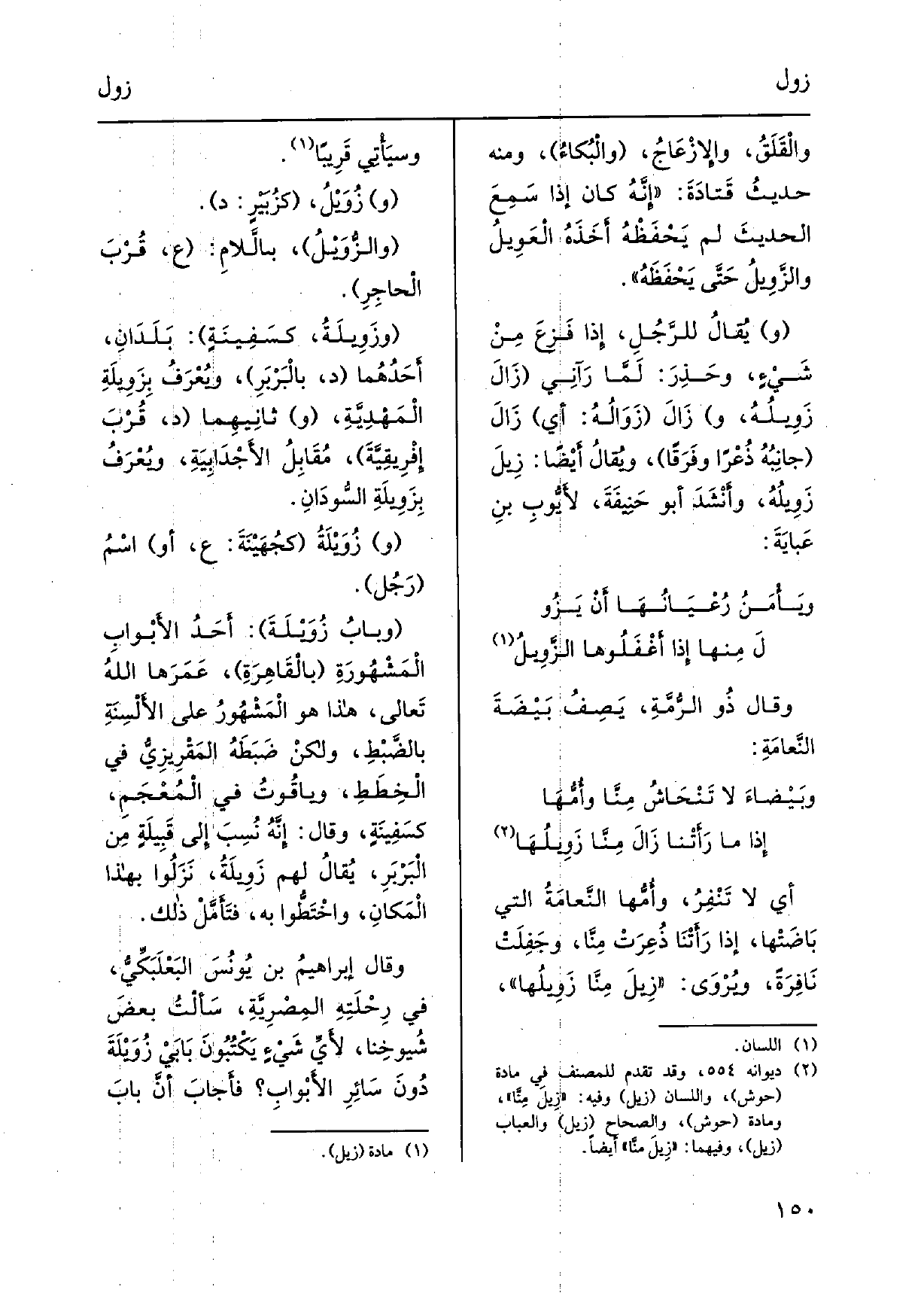 أَي لَا تَنْفِرُ، وأُمُّها النَّعامَةُ الَّتِي بَاضَتْها، إِذا رَأَتْنَا ذُعِرَتْ مِنَّا، وجَفِلَتْ نَافِرَةً، ويُرْوَى: {زِيلَ مِنَّا} زَوِيلُها، وسيَأْتِي قَريباً. (و) {زوَيْلُ، كزُبَيْرٍ: د.} والزُّوَيلُ، باللاّمِ: ع، قُرْبَ الْحاجِرِ. {وزَوِيلَةُ، كَسَفِينَةٍ: بَلَدَانِ، أَحَدُهُما د، بالْبَرْبَرِ، ويُعْرَفُ} بِزَوِيلَةِ الْمَهْدِيَّةِ، وثانِيهِما د، قُرْبِ إِفْرِيقِيَّةَ، مُقابِلُ الأَجْدَابِيَةِ، ويُعْرَفُ بِزَوِيلَةِ السُّودَانِ. (و) {زُوَيْلَةُ كجُهَيْنَةَ: ع، أَو اسْمُ رَجُل. وبابُ زَوِيلَةَ: أَحَدُ الأَبْوابِ الْمَشْهُورَةِ بالْقَاهِرَةِ، عَمَرَها اللهُ تَعالى، هَذَا هُوَ الْمَشْهُورُ على الأَلْسِنَةِ بالضَّبْطِ، ولكنْ ضَبَطَهُ المَقْرِيزِيُّ فِي الْخِطَطِ، وياقُوتُ فِي الْمُعْجَمِ، كَسَفِينَةٍ، وَقَالَ: إِنَّهُ نُسِبَ إِلى قَبِيلَةٍ مِن البَرْبَرِ، يُقالُ لَهُم} زَوِيلَةُ، نَزَلُوا بِهَذَا الْمَكانِ، واخْتَطُّوا بِهِ، فتَأَمًَّل ذَلِك. وَقَالَ إبراهيمُ بن يُونُسَ البَعْلَبَكِّيُّ، فِي رِحْلَتِهِ المِصْرِيَّةِ، سَأْلتُ بعضَ شُيُوخِنا، لأَيِّ شَيْءٍ يَكْتُبُونَ بَابَيْ زُوَيْلَةَ دُونَ سَائِرِ الأَبْوابِ فأَجابَ أنَّ بابَ