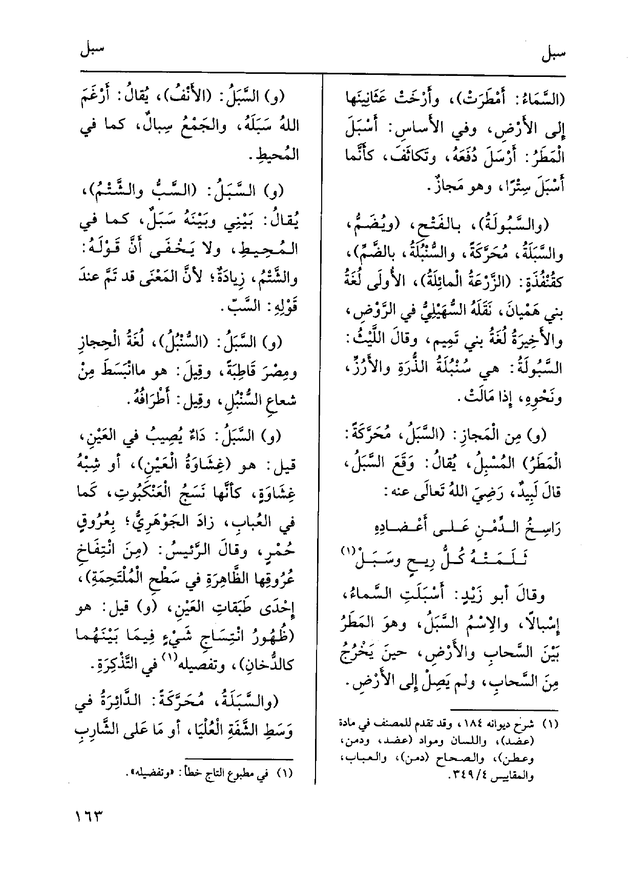 وقالَ أَبُو زَيْدٍ: أَسْبَلَتِ السَّماءُ، إِسْبالاً، والاِسْمُ السَّبَلُ، وَهُوَ المَطَرُ بَيْنَ السَّحابِ والأَرْضِ، حينَ يَخْرُجُ مِنَ السَّحابِ، وَلم يَصِلُ إِلَى الأَرْضِ. والسَّبَلُ: الأَنْفُ، يُقالُ: أَرْغَمَ اللهُ سَبَلَهُ، والجَمْعُ سِبالٌ، كَمَا فِي المُحيطِ. والسَّبَلُ: السَّبُ والشَّتْمُ، يُقالُ: بَيْنِي وبَيْنَهُ سَبَلٌ، كَمَا فِي المُحِيطِ، وَلَا يَخْفَى أنَّ قَوْلَهُ: والشَّتْمُ: زِيادَةٌ، لأنَّ المَعْنَى قد تَمَّ عندَ قَوْلِهِ: السَّبّ. والسَّبَلُ: السُّنْبُلُ، لُغَةُ الحِجازِ ومِصْرَ قَاطِبَةً، وقِيلَ: هُوَ مَا انْبَسَطَ مِنْ شعاعِ السُّنْبُلِ، وقِيل: أَطْرَافُهُ. والسَّبَلُ: دَاءٌ يُصِيبُ فِي العَيْنِ، قيل: هُوَ غِشَاوَةٌ الْعَيْنِ، أَو شِبْهُ غِشَاوَةٍ، كأنَّها نَسَجُ الْعَنْكَبُوتِ، كَما فِي العُبَابِ، زادَ الجَوْهَرِيُّ، بِعُرُوقٍ حُمْرٍ، وقالَ الرَّئِيسُ: مِنَ انْتِفَاخِ عُرُوقِها الظَّاهِرَةِ فِي سَطْحِ الْمُلْتَحِمَةِ، إِحْدَى طَبَقاتِ العَيْنِ، وَقيل: هُوَ ظُهُورُ انْتِسَاجِ شَيْءٍ فِيمَا بَيْنَهُما كالدُّخانِ، وتفصيله فِي التَّذْكِرَةِ. والسَّبَلَةُ: مُحَرَّكَةً: الدَّائِرَةُ فِي وَسَطِ الشَّفَةِ الْعُلْيَا، أَو مَا عَلى الشَّارِبِ