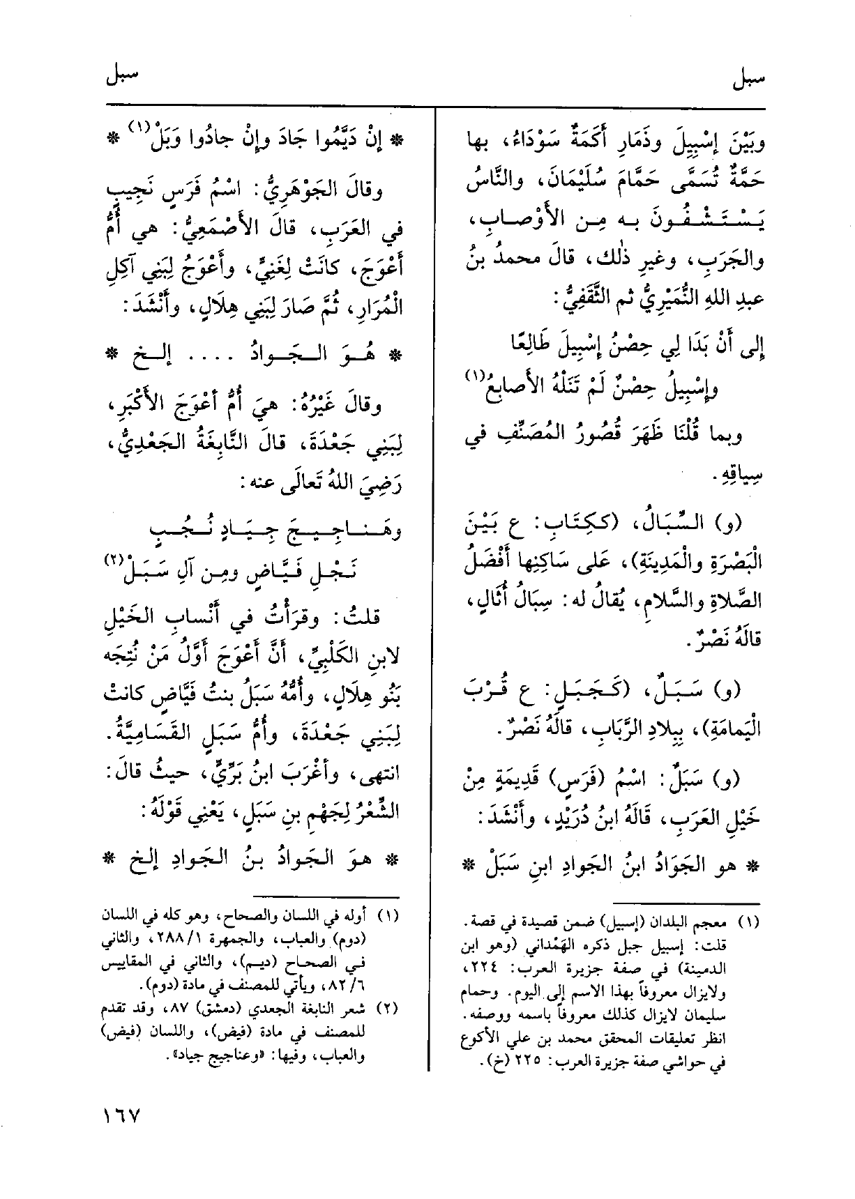 قلتُ: وقَرَأْتُ فِي أَنْسابِ الخَيْلِ لابنِ الكَلْبِيِّ، أَنَّ أَعْوَجَ أَوَّلُ مَنْ نُتِجَه بَنُو هِلاَلٍ، وأُمُّهُ سَبَلُ بنتُ فَيَّاضٍ كانتْ لِبَنِي جَعْدَةَ، وأُمُّ سَبَلٍ القَسَامِيَّةُ. انْتهى، وأغْرَبَ ابنُ بَرِّيٍّ، حيثُ قالَ: الشِّعْرُ لِجَهْمِ بنِ سَبَلٍ، يَعْنِي قَوْلَهُ: هوَ الجَوادُ بنُ الجَوادِ إِلَخ