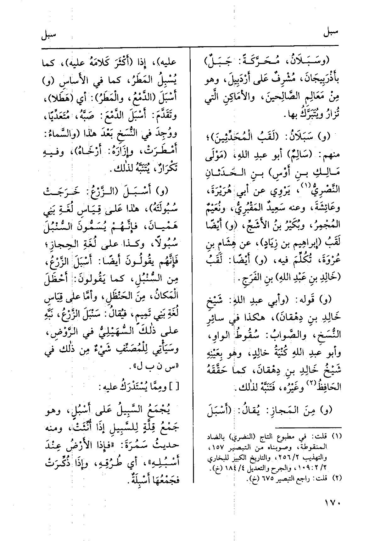 وسَبَلانُ، مُحَرَّكَةً: جَبَلٌ بَأذْرَبِيجَانَ، مُشْرفٌ عَلى أَرْدَبِيلَ، وَهُوَ مِنْ مَعالِم الصَّالِحينَ، والأمَاكِنِ الَّتِي تُزَارُ ويُتَبَرَّكُ بهَا. وسَبَلاَنُ: لَقَبُ الْمُحَدِّثِينَ، مِنْهُم: سَالِمٌ أَبُو عبدِ اللهِ، مَوْلَى مَالِكِ بنِ أَوْسِ بنِ الحَدَثانِ النَّصْرِيُّ، يَرْوِي عَن أبي هُرَيْرَةَ، وعائِشَةَ، وَعنهُ سَعِيدٌ المَقْبُرِيُّ، ونُعَيْمٌ المُجْمرُ، وبُكَيرُ بنُ الأَشَجِّ، وأَيْضَاً لَقَبُ إِبْراهِيم بن زِيَادٍ، عَن هِشام بنِ عُرْوَةَ، تُكُلِّمَ فِيهِ، وأَيْضَاً: لَقَبُ خَالِدِ بنِ عَبْدِ اللهِ بنِ الفَرَجِ. وقَوْله: وَأبي عبدِ اللهِ: شَيْخِ خالدِ بنِ دِهْقانَ، هَكَذَا فِي سائِرِ النُّسَخِ، والصّوابُ: سُقُوطُ الواوِ، وَأَبُو عبدِ اللهِ كُنْيَةُ خالِدٍ، وَهُوَ بِعَيْنِهِ شَيْخُ خالِدِ بنِ دِهْقانَ، كَمَا حَقَّقَهُ الحافِظُ وغَيْرُه، فَتَنَبَّهْ لذَلِك. وَمن المَجازِ: يُقالُ: أَسْبَلَ عَلَيْهِ، إِذا أَكْثَرَ كَلامَهُ عَلَيْهِ، كَمَا يُسْبِلُ المَطَرُ، كَمَا فِي الأَساسِ وأَسْبَلَ الدَّمْعُ، والْمَطَلُ: أَي هَطَلا، وتَقَدَّمَ أَسْبَلَ الدَّمْعَ: صَبَّهُ، مُتَعَدِّياً، ووُجِدَ فِي النُّسَخِ بَعْدَ هَذَا والسَّماءُ:) أَمْطَرَتْ، وإِزَارَهُ: أَرْخَاهُ، وفيهِ تَكْرَارٌ، يُتَنَبَّهُ لذَلِك. وأَسْبَلَ الزَّرْعُ: خَرَجَتْ سُبُولَتَهُ، هَذَا عَلى قِياسِ لُغَةِ بَنِي هَمْيانَ، فإِنَّهُمْ يُسَمُّونَ السُّنْبُلَ سُبُولاً، وَكَذَا على لُغَةِ الحِجازِ، فإِنَّهُم يقُولُونَ أَيْضاً: أَسْبَلَ الزَّرْعَ، مِن السُّنْبُلِ، كَمَا يَقُولُونَ: أَحْظَلَ الْمَكانُ، مِنَ الحَنْظَلِ، وأمَّا على قِيَاسِ لُغَةِ بَنِي تَمِيمٍ، فيُقال: سَنْبَلَ الزَّرْعُ، نَبَّه على ذَلِك السّهَيْلِيُّ فِي الرَّوْضِ، وسَيَأْتِي لِلْمُصَنِّفِ شَيْءٌ من ذَلِك فِي س ن ب ل. وممّا يُسْتَدْرَكُ عَلَيْهِ: يُجْمَعُ السَّبِيلُ عَلى أَسْبُلٍ، وَهُوَ جَمْعُ قِلَّةٍ لِلسَّبِيلِ عَلى أَسْبُلٍ، وَهُوَ جَمْعُ قِلَّةٍ لِلسَّبِيلِ إِذَا انِّثَتْ، وَمِنْه حديثُ سَمْرَةَ: فإِذَا الأَرْضُ عِنْدَ أَسبُلِهِ، أَي طُرُقِهِ، وإِذَا ذُكِّرَتْ فجَمْعُهَا أَسْبِلَةٌ.