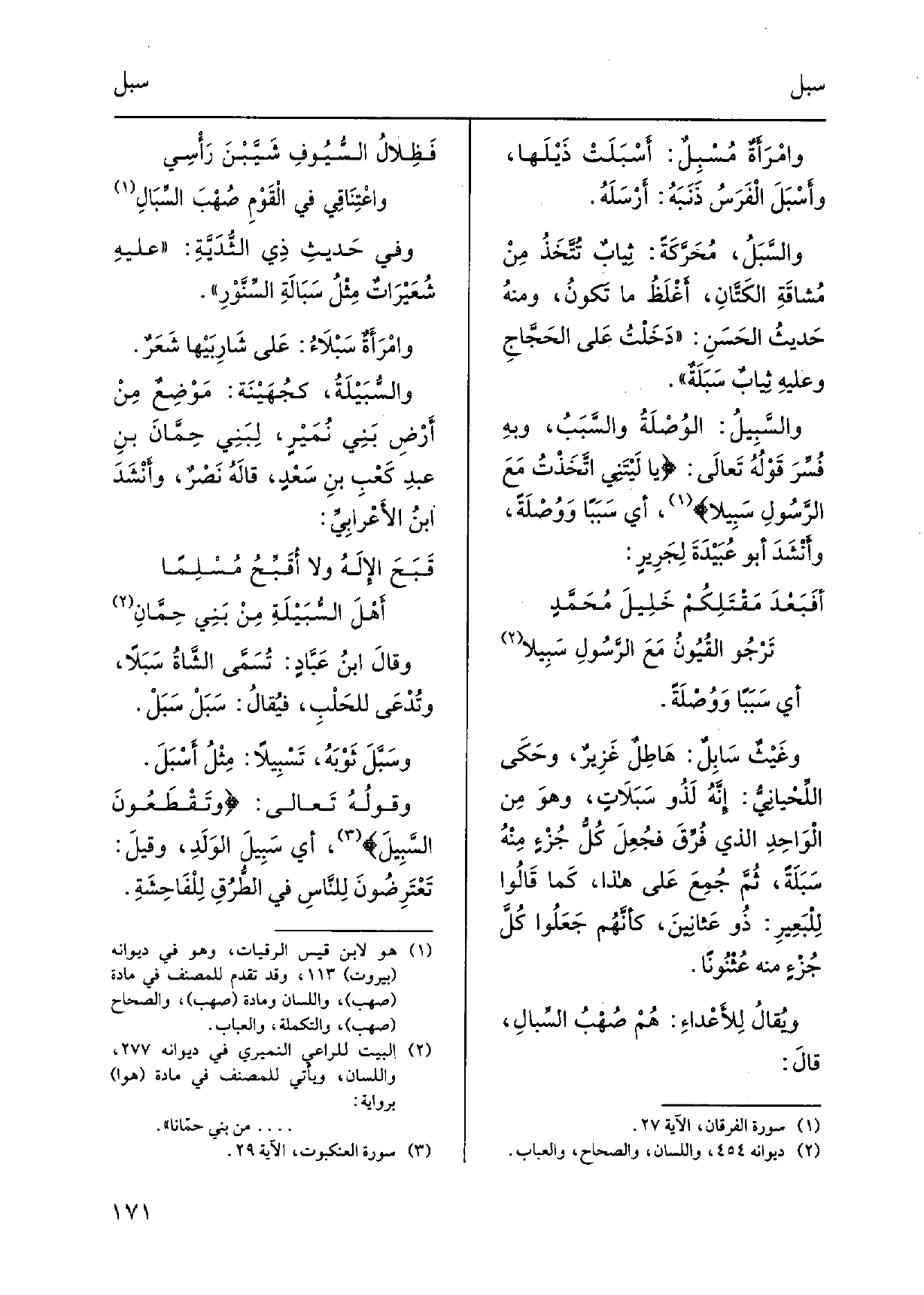 وامْرَأَةٌ مُسْبِلٌ: أَسْبَلَتْ ذَيْلَها، وأَسْبَلَ الْفَرَسُ ذَنَبَهُ: أَرْسَلَهُ. والسَّبَلُ، مُحَرَّكَةً: ثِيابٌ تُتَّخَذُ مِنْ مُشاقَّةِ الكَتَّانِ، أَغْلَظُ مَا تَكونُ، ومنهُ حديثُ الحَسَنِ: دَخَلْتُ عَلى الحَجَّاجِ وعليهِ ثِيابٌ سَبَلَةٌ. والسَّبِيلُ: الوُصْلَةُ والسَّبَبُ، وبهِ فُسِّرَ قَوْلُهُ تَعالى: وَيَا لَيْتَنِي اتَّخَذْتُ مَعَ الرَّسُولِ سَبِيلا، أَي سَبَباً ووُصْلَةً، وأَنْشَدَ أَبُو عُبَيْدَةَ لِجَرِيرٍ: